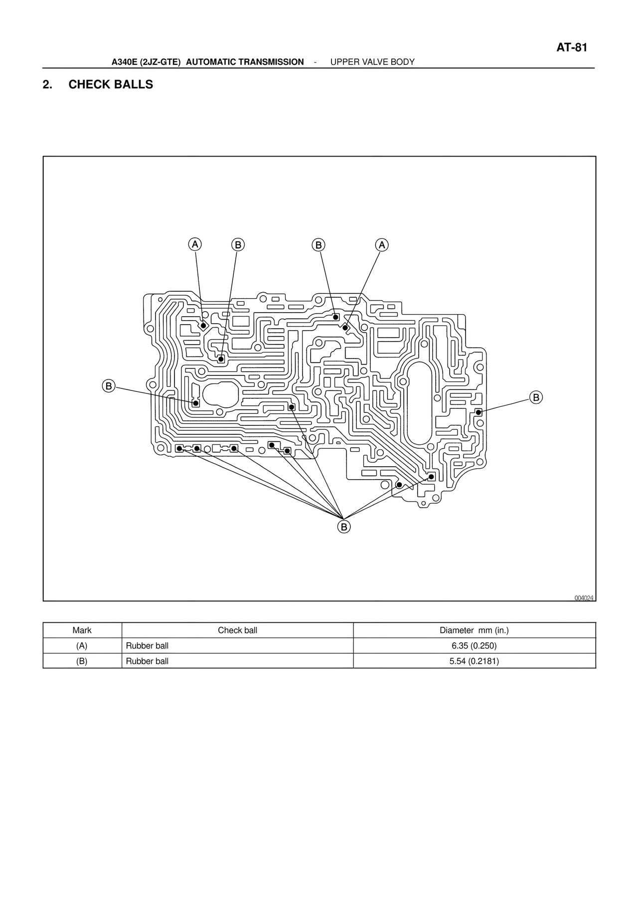 AT-81 A340E (2JZ-GTE) AUTOMATIC TRANSMISSION - UPPER VALVE BODY 2. CHECK BALLS A B B A B B B 004024 Mark Check ball Diameter mm (in.) (A) Rubber ball 6.35 (0.250) (B) Rubber ball 5.54 (0.2181)