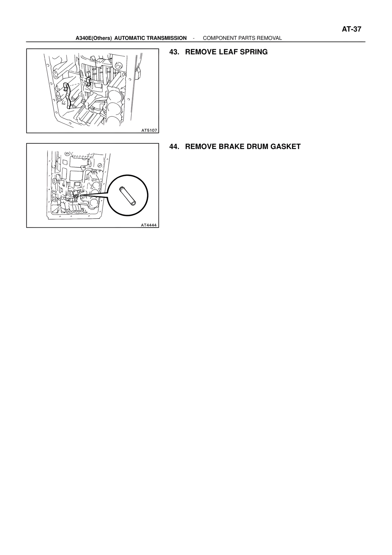 AT-37 A340E(Others) AUTOMATIC TRANSMISSION - COMPONENT PARTS REMOVAL 43. REMOVE LEAF SPRING AT5107 44. REMOVE BRAKE DRUM GASKET AT4444