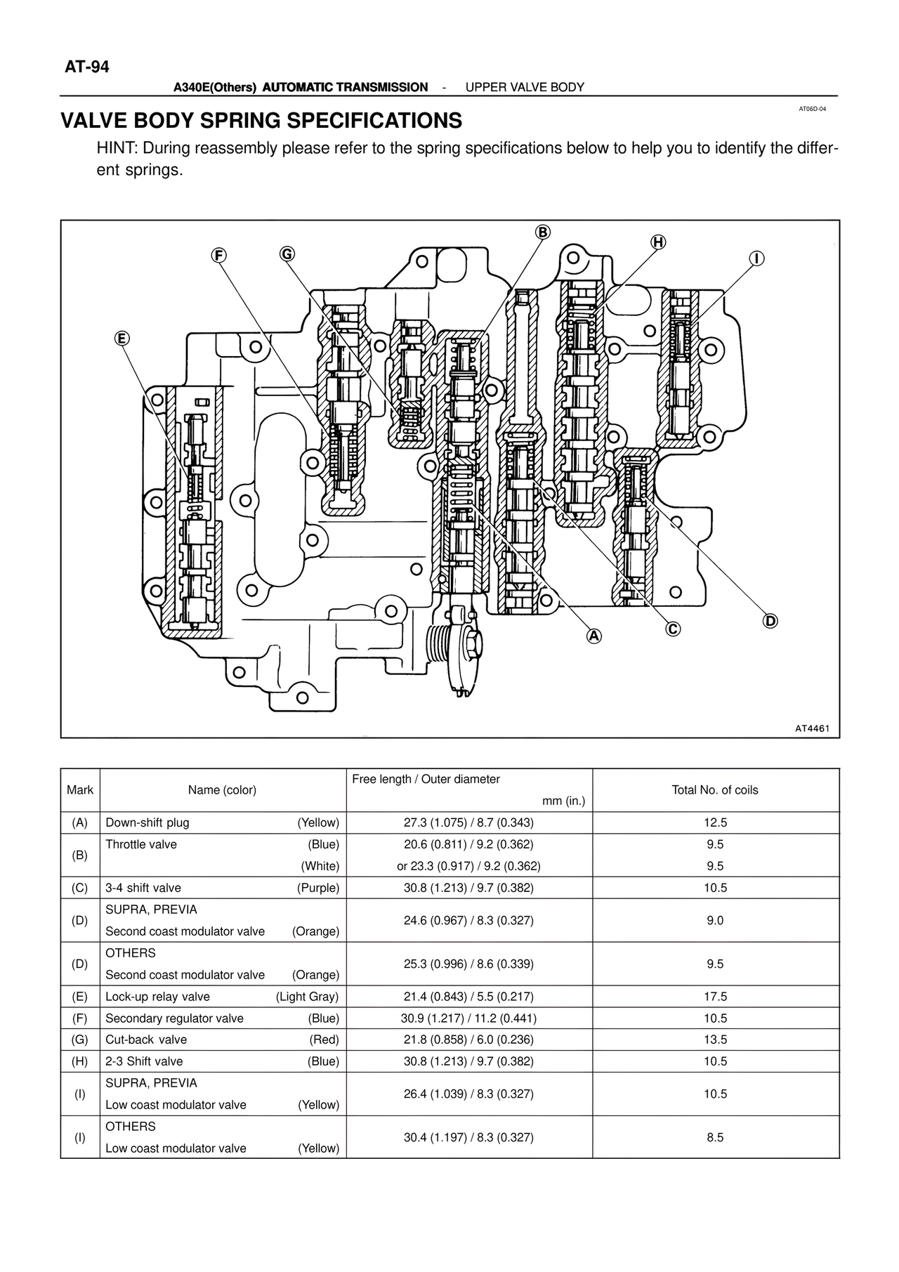 VALVE BODY SPRING SPECIFICATIONS