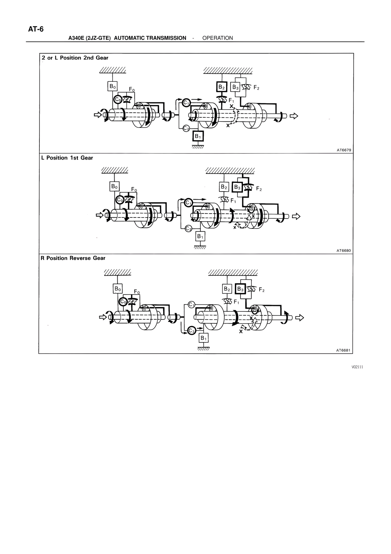 AT-6 A340E (2JZ-GTE) AUTOMATIC TRANSMISSION - OPERATION 2 or L Position 2nd Gear B0 F0 C0 B2 B3 F2 F1 C1 C2 B1 AT6679 L Position 1st Gear B0 F0 C0 B2 B3 F2 F1 C1 C2 B1 AT6680 R Position Reverse Gear B0 F0 C0 B2 B3 F2 F1 C1 C2 B1 AT6681 V02111