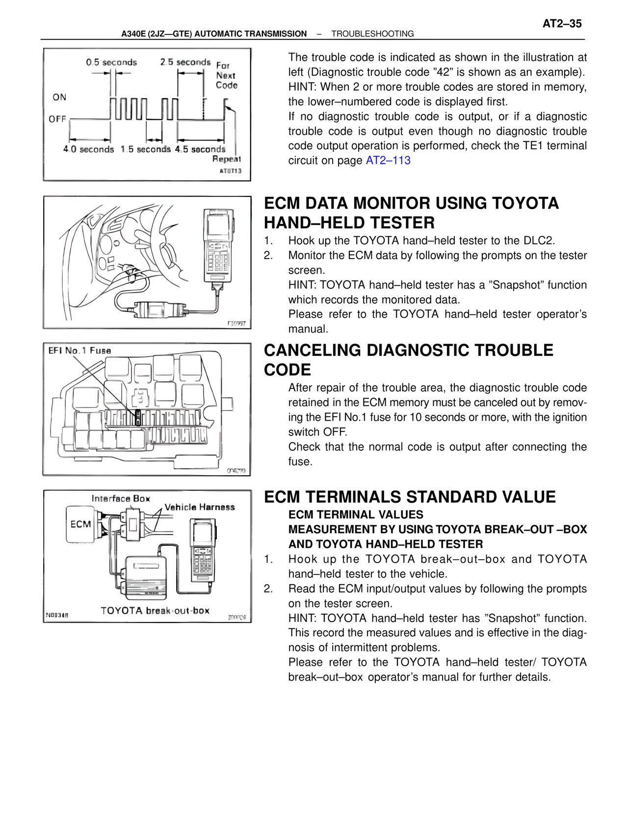 If no diagnostic trouble code is output, or if a diagnostic trouble code is output even though no diagnostic trouble code output operation is performed, check the TE1 terminal circuit on page AT2–113