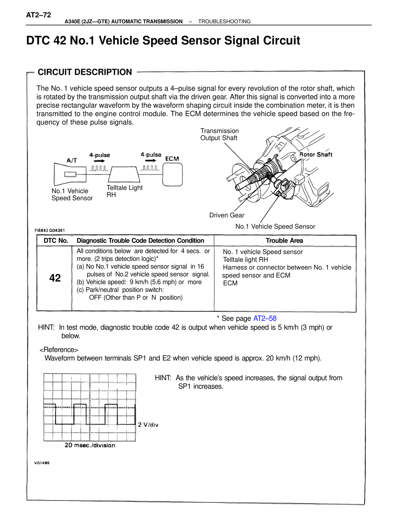 DTC 42 No.1 Vehicle Speed Sensor Signal Circuit