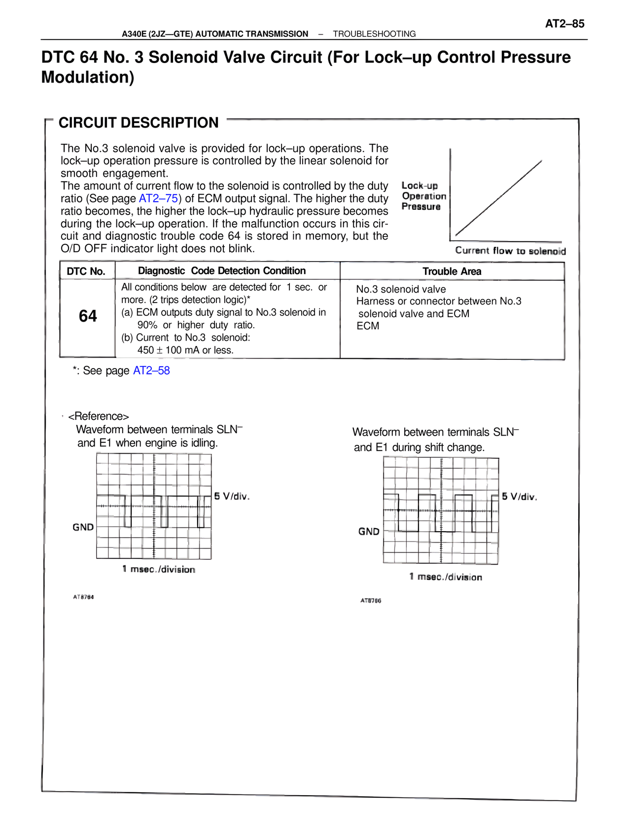 The amount of current flow to the solenoid is controlled by the duty ratio (See page AT2–75) of ECM output signal. The higher the duty ratio becomes, the higher the lock–up hydraulic pressure becomes during the lock–up operation. If the malfunction occurs in this circuit and diagnostic trouble code 64 is stored in memory, but the O/D OFF indicator light does not blink.
