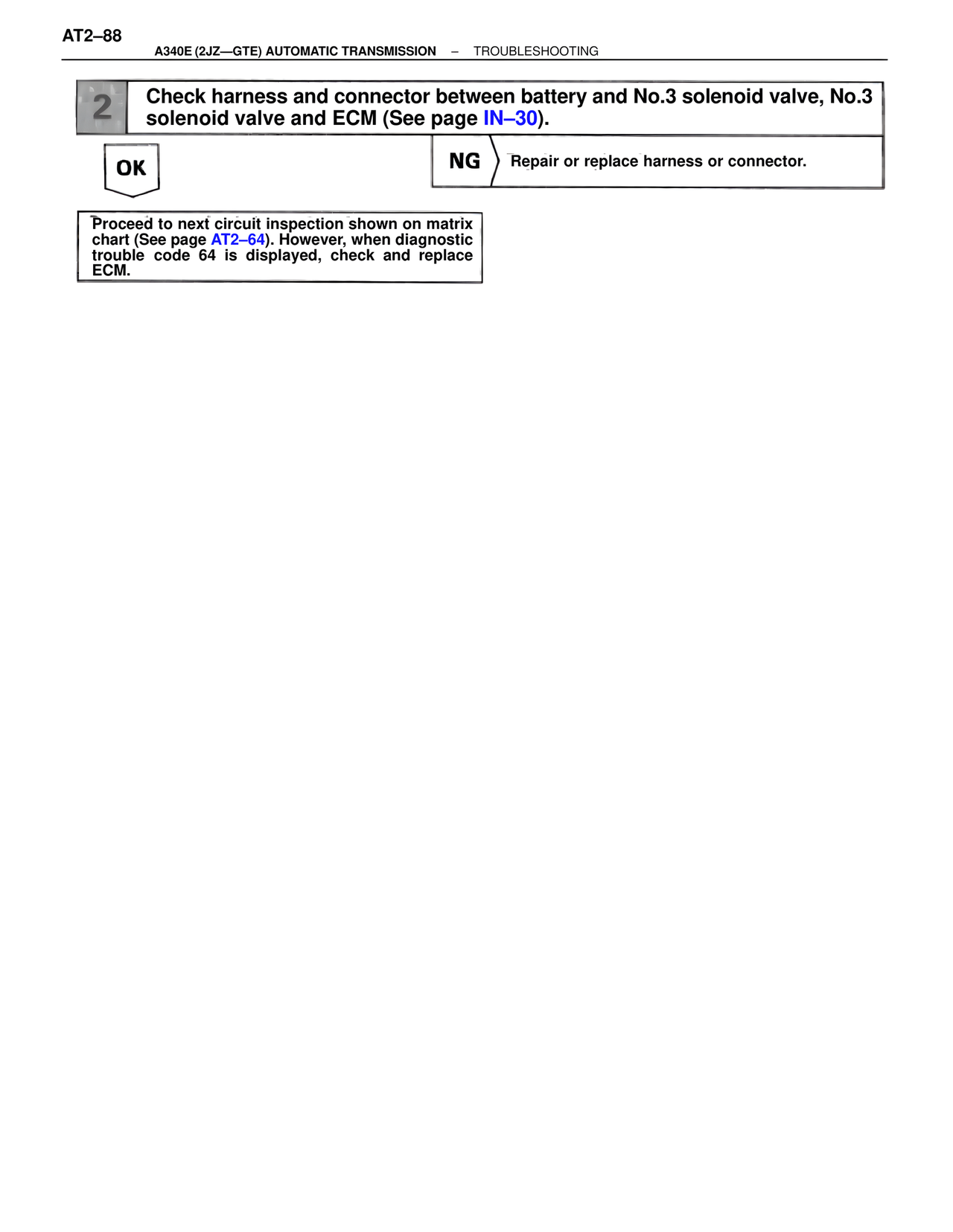 Proceed to next circuit inspection shown on matrix chart (See page AT2–64). However, when diagnostic trouble code 64 is displayed, check and replace ECM.