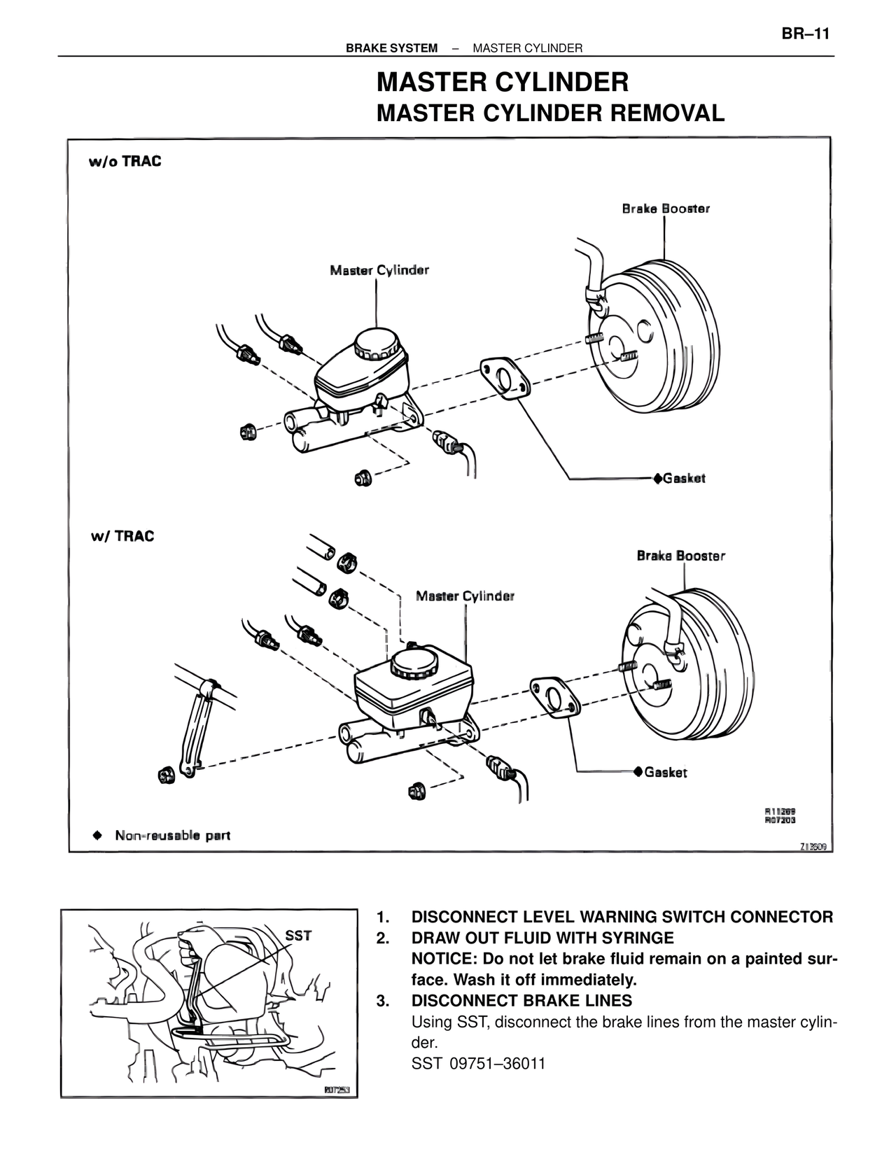 Using SST, disconnect the brake lines from the master cylin-