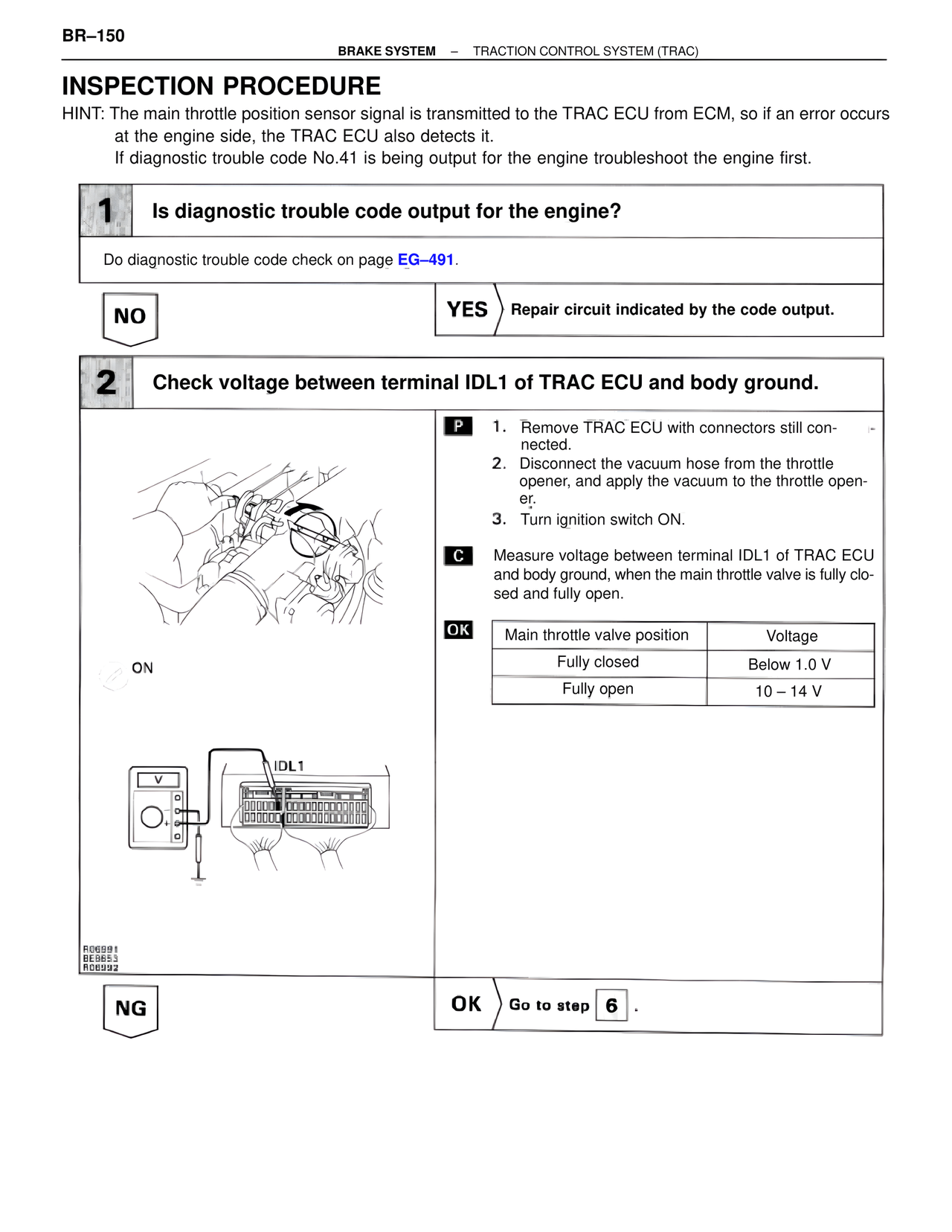 C Measure voltage between terminal IDL1 of TRAC ECU and body ground, when the main throttle valve is fully closed and fully open.