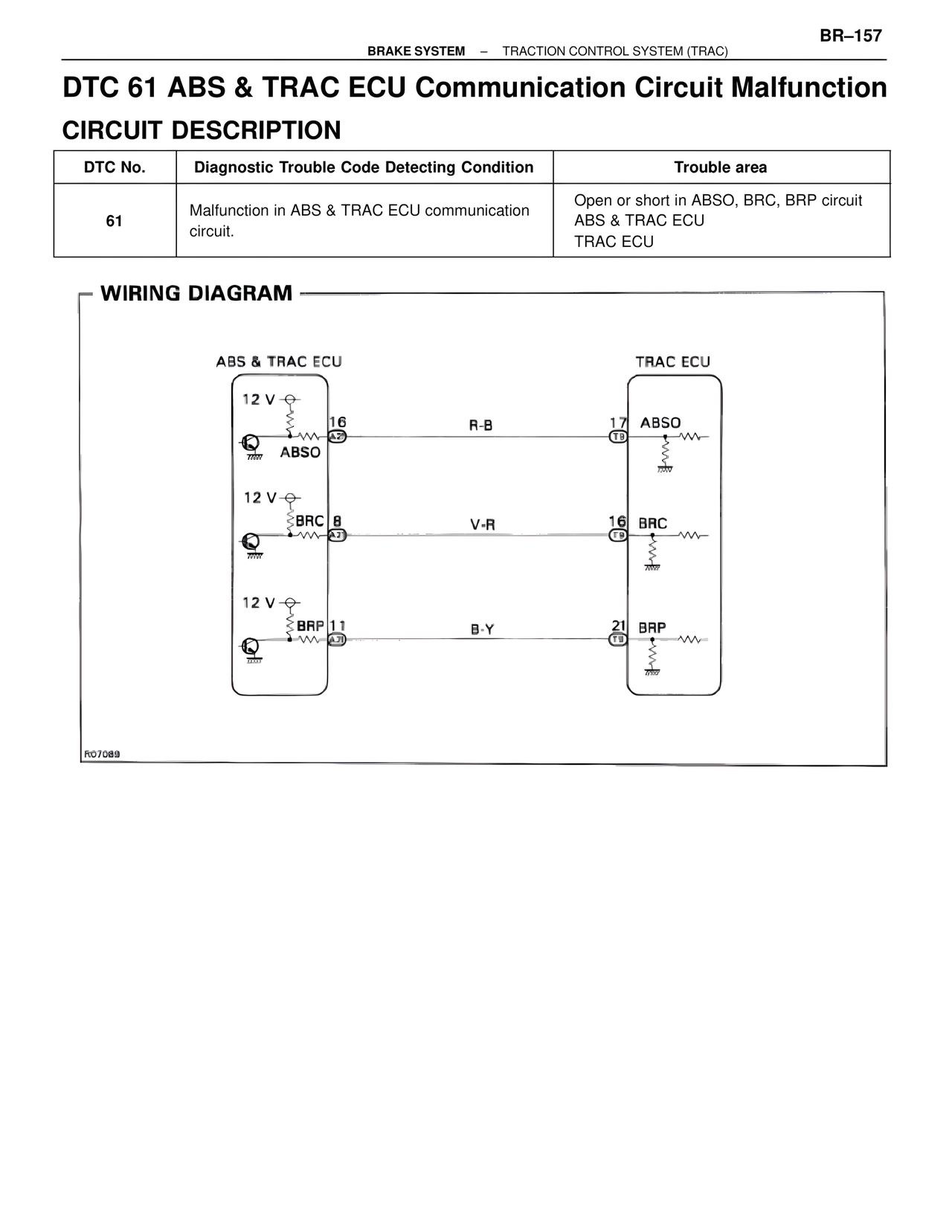 61 | Malfunction in ABS & TRAC ECU communication circuit. | Open or short in ABSO, BRC, BRP circuit