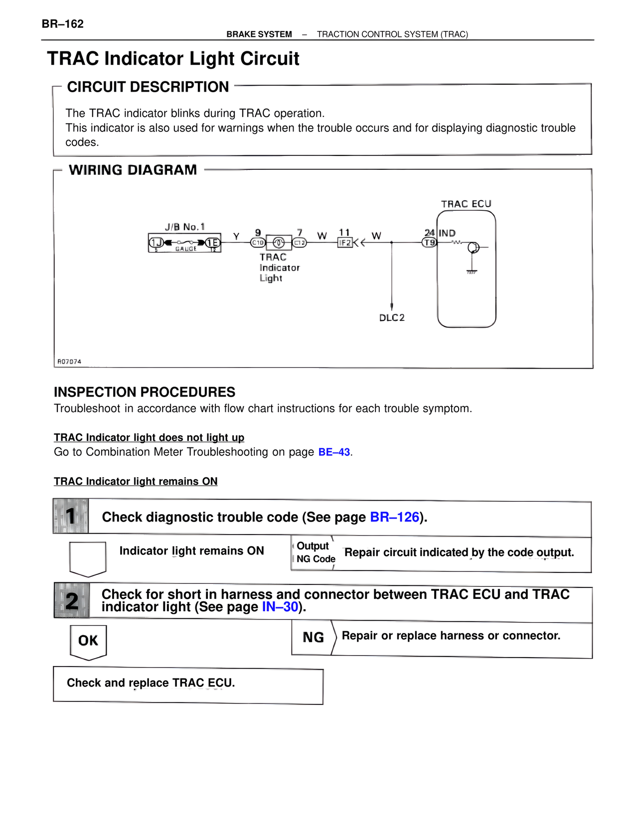 2 Check for short in harness and connector between TRAC ECU and TRAC indicator light (See page IN–30).