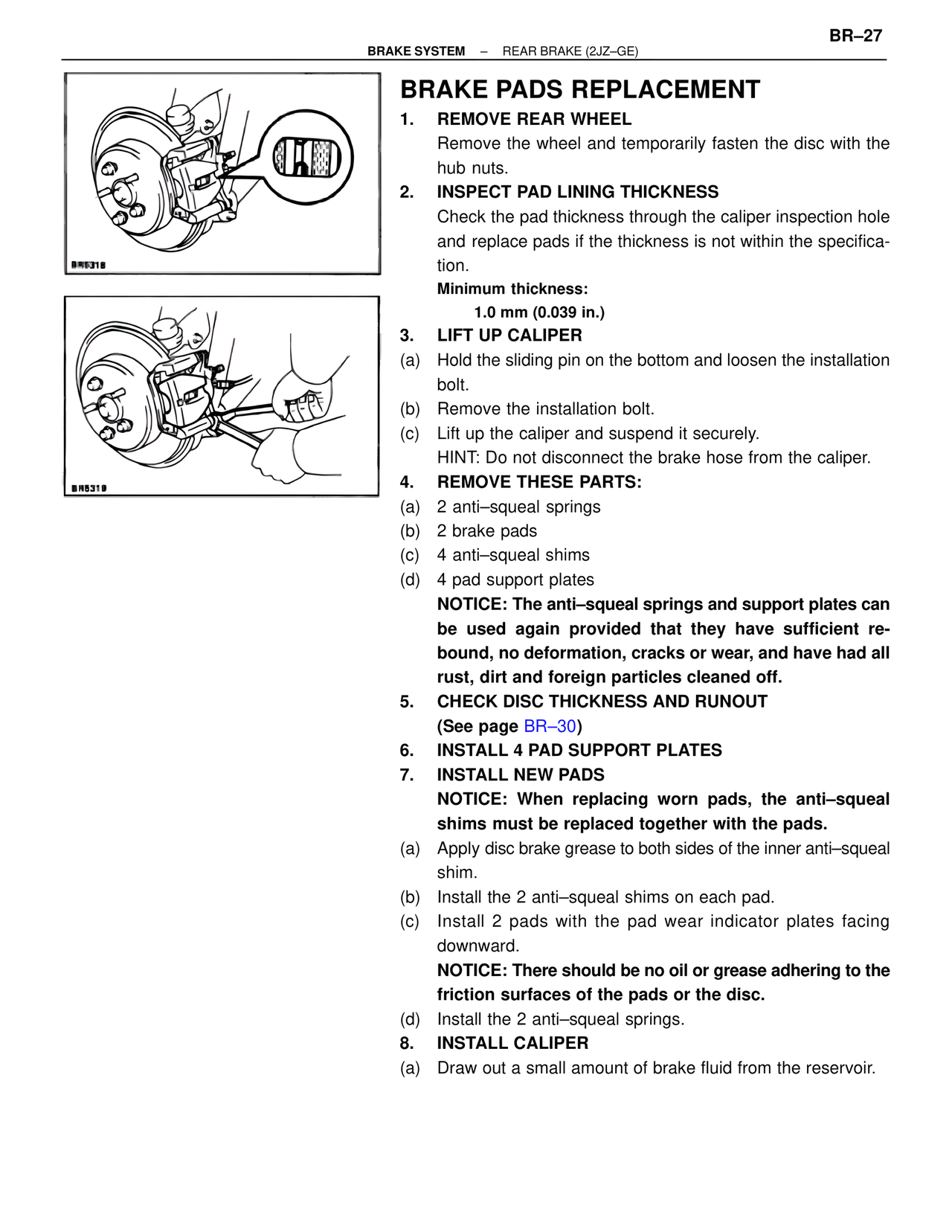 NOTICE: The anti–squeal springs and support plates can be used again provided that they have sufficient rebound, no deformation, cracks or wear, and have had all rust, dirt and foreign particles cleaned off.