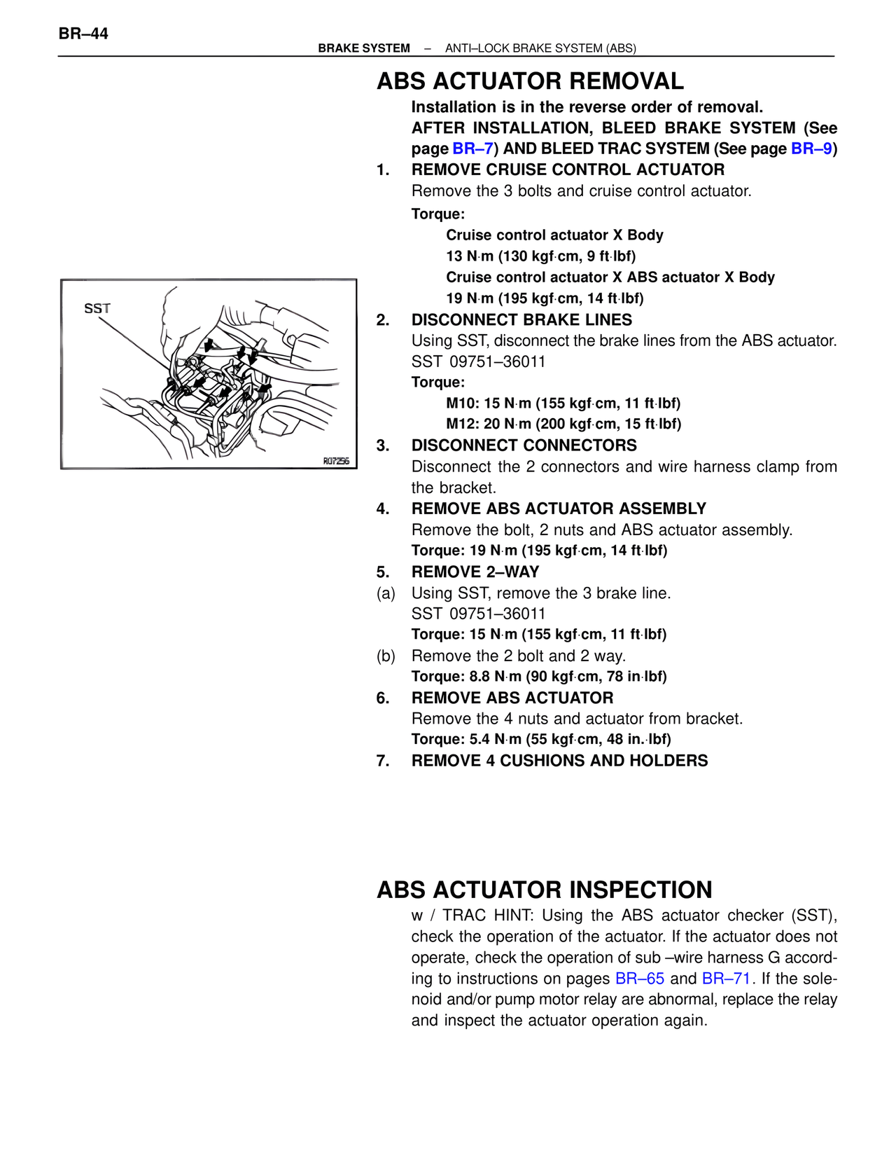 w / TRAC HINT: Using the ABS actuator checker (SST), check the operation of the actuator. If the actuator does not operate, check the operation of sub –wire harness G according to instructions on pages BR–65 and BR–71. If the solenoid and/or pump motor relay are abnormal, replace the relay and inspect the actuator operation again.