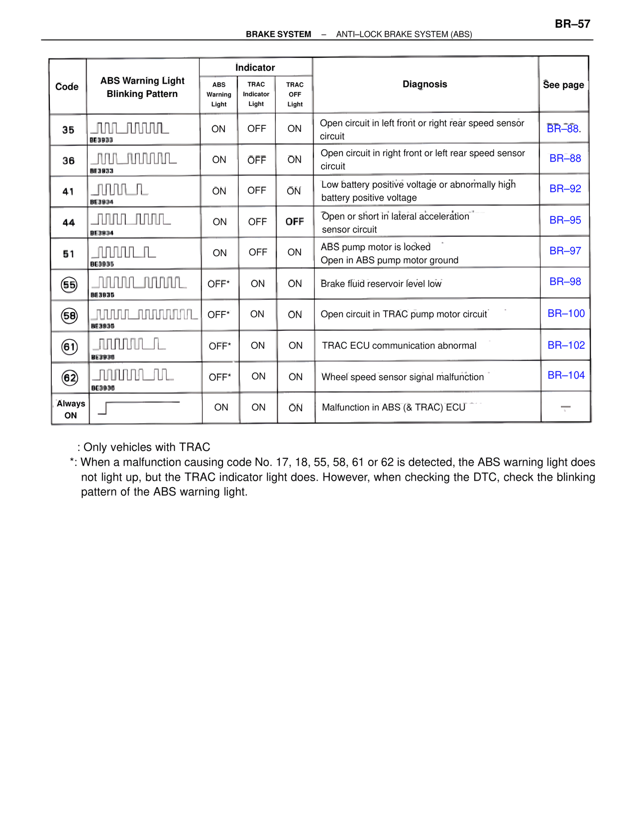 *: When a malfunction causing code No. 17, 18, 55, 58, 61 or 62 is detected, the ABS warning light does not light up, but the TRAC indicator light does. However, when checking the DTC, check the blinking pattern of the ABS warning light.