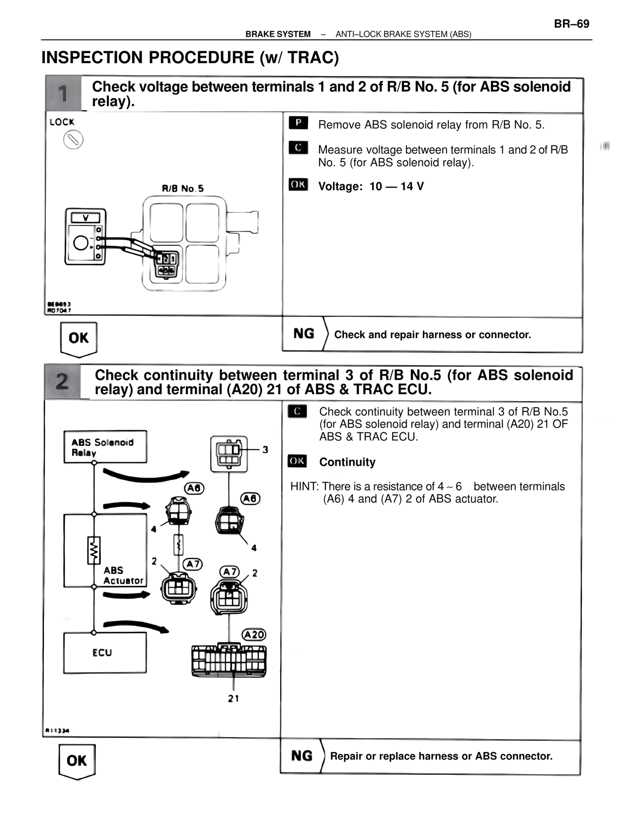 C Check continuity between terminal 3 of R/B No.5 (for ABS solenoid relay) and terminal (A20) 21 OF ABS & TRAC ECU.