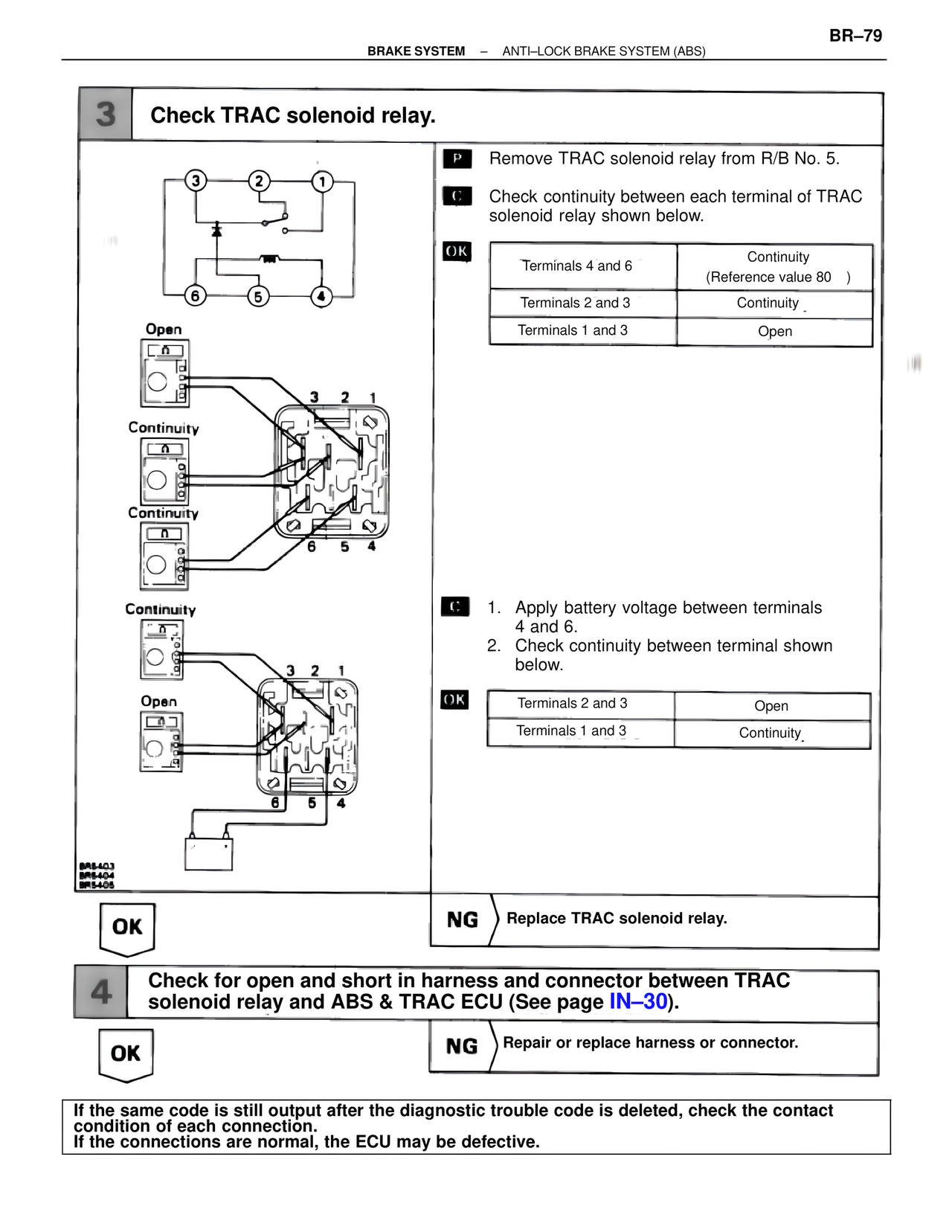 4 Check for open and short in harness and connector between TRAC solenoid relay and ABS & TRAC ECU (See page IN–30).