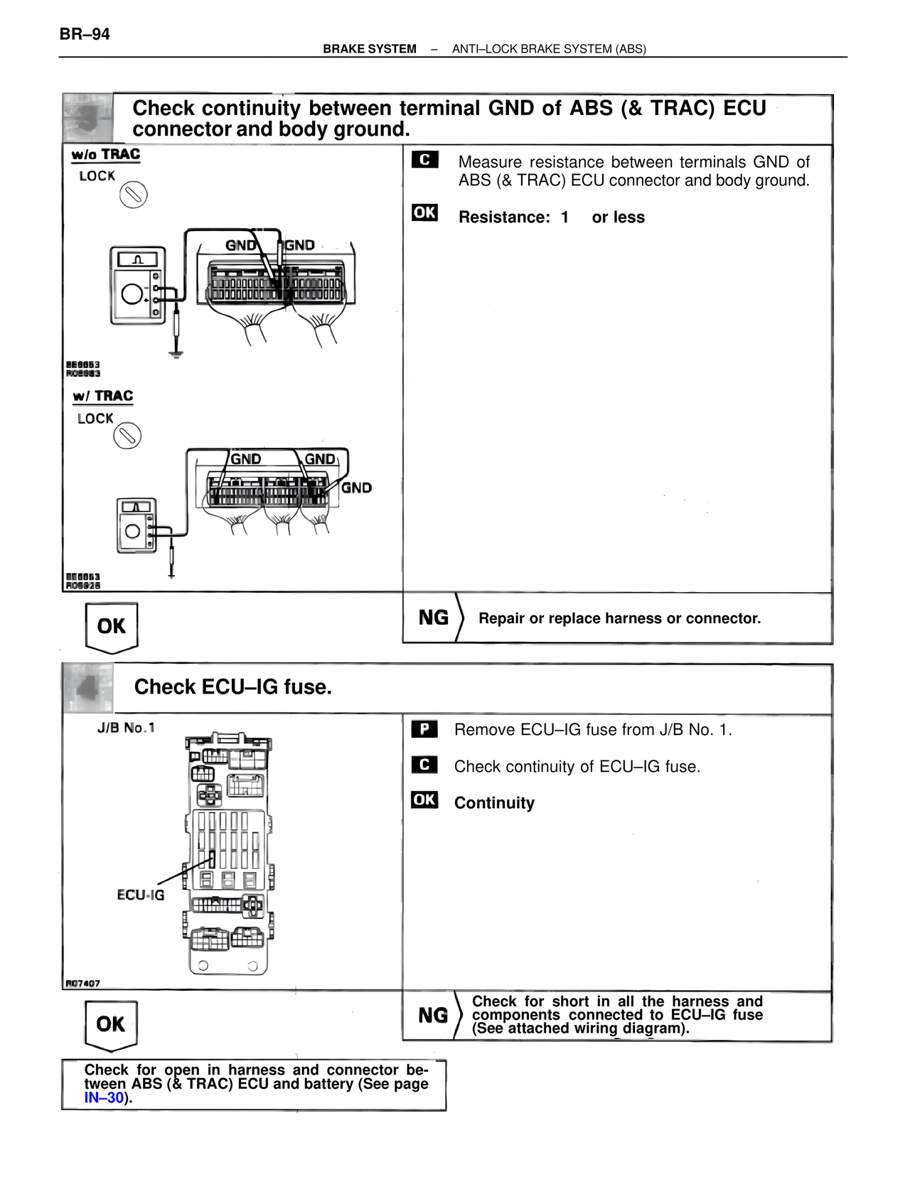 Check for open in harness and connector between ABS (& TRAC) ECU and battery (See page IN–30).