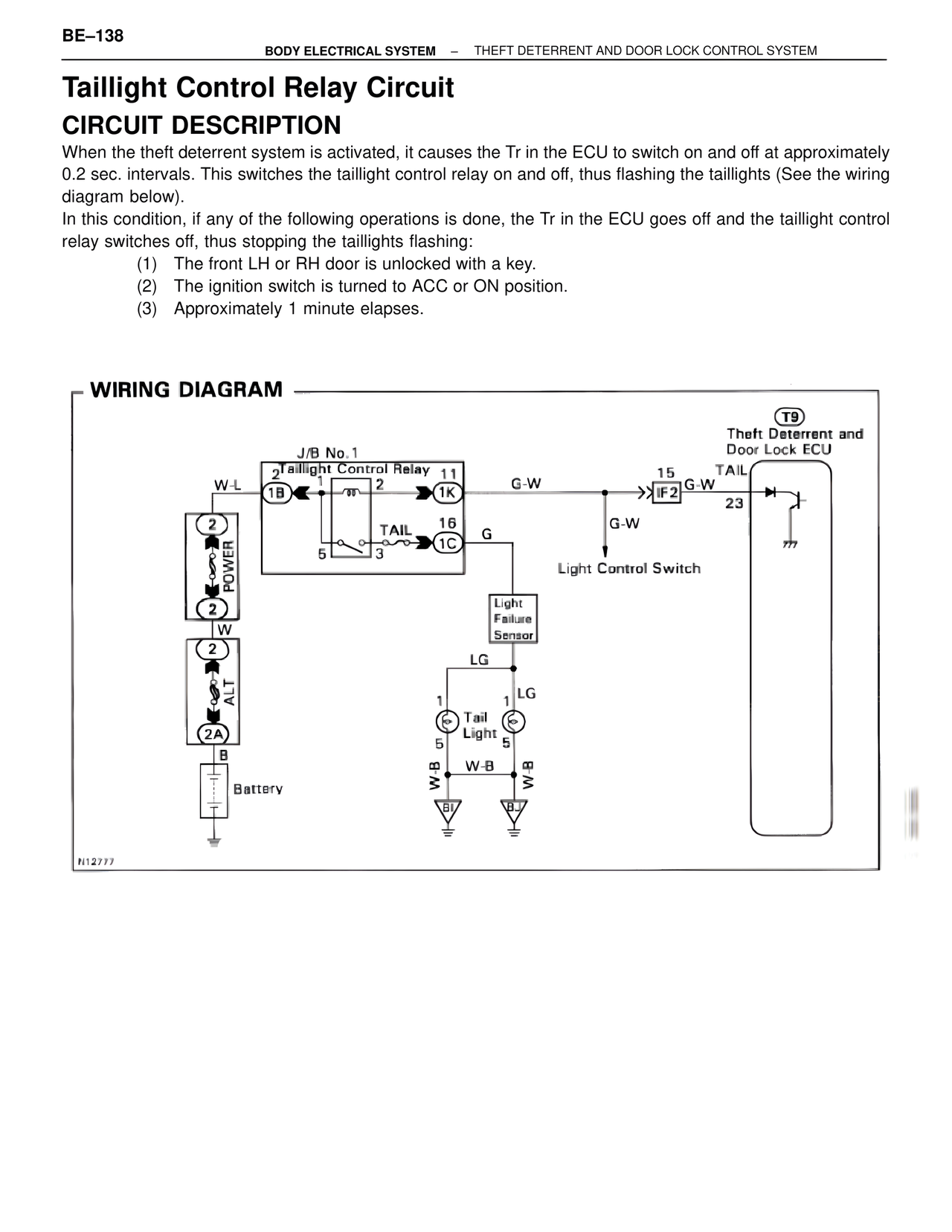 When the theft deterrent system is activated, it causes the Tr in the ECU to switch on and off at approximately 0.2 sec. intervals. This switches the taillight control relay on and off, thus flashing the taillights (See the wiring diagram below).