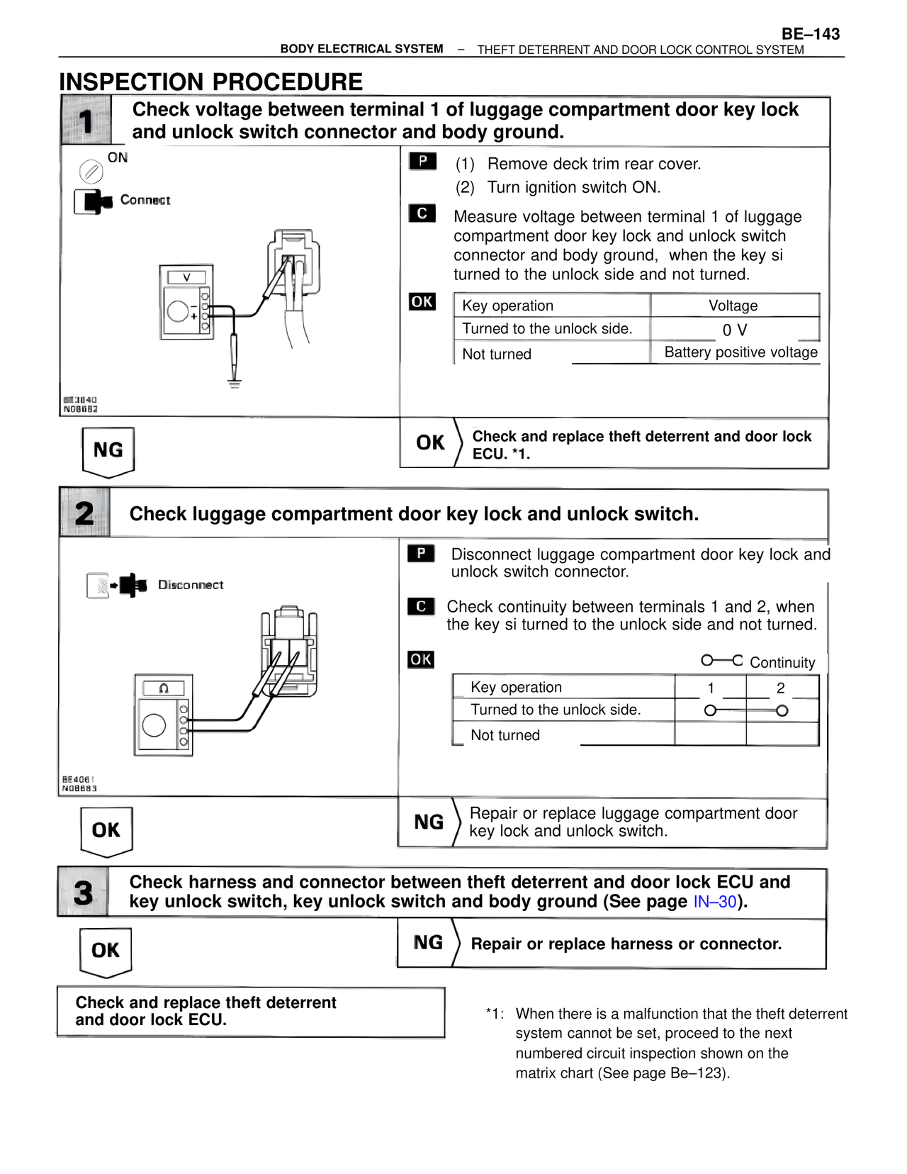 3 Check harness and connector between theft deterrent and door lock ECU and key unlock switch, key unlock switch and body ground (See page IN-30).