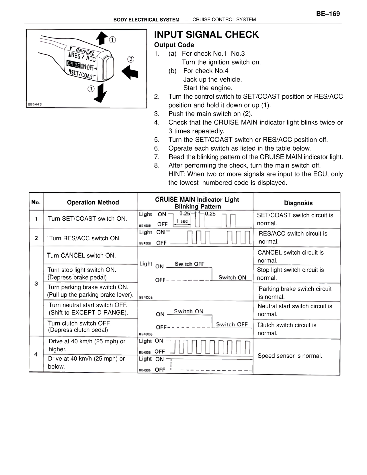 BE4005 OFF 1 sec | SET/COAST switch circuit is normal.