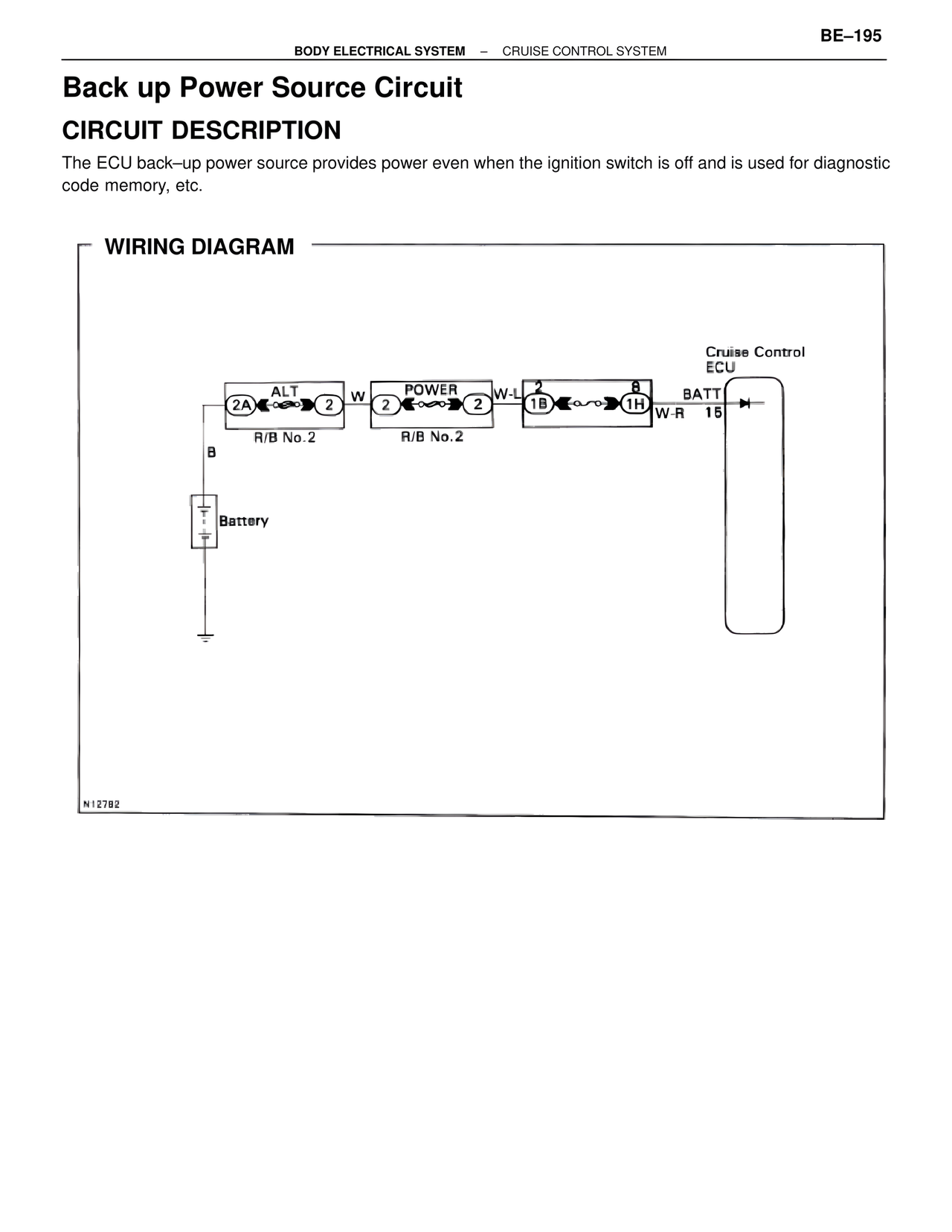 The ECU back–up power source provides power even when the ignition switch is off and is used for diagnostic code memory, etc.
