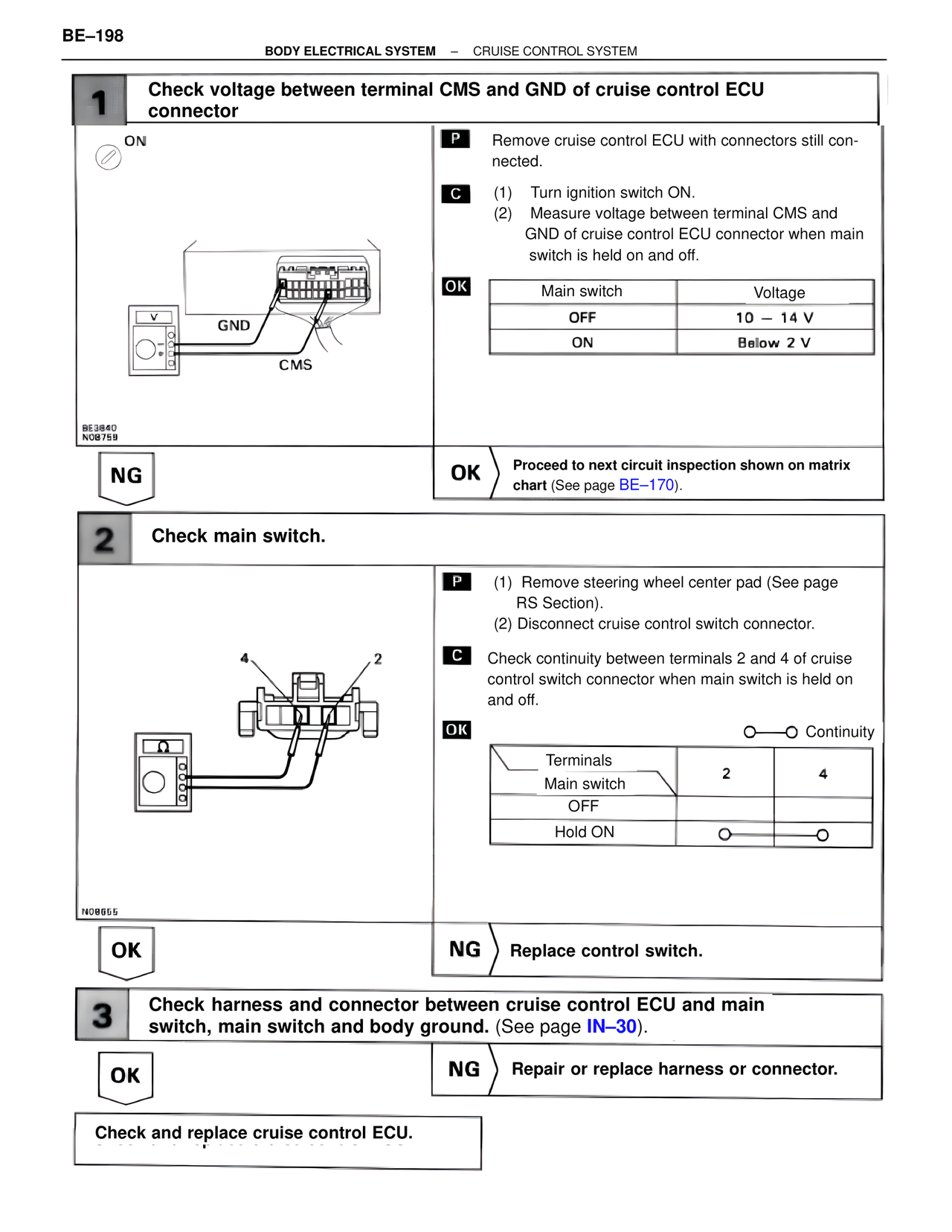 3 Check harness and connector between cruise control ECU and main switch, main switch and body ground. (See page IN–30).