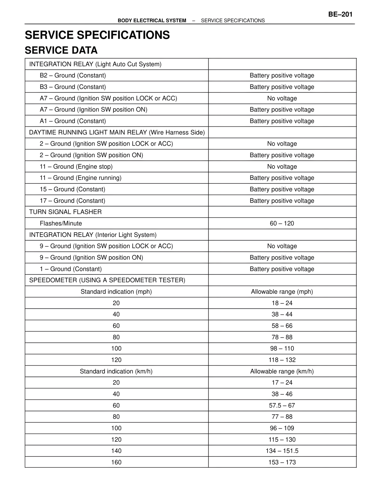 BODY ELECTRICAL SYSTEM – SERVICE SPECIFICATIONS