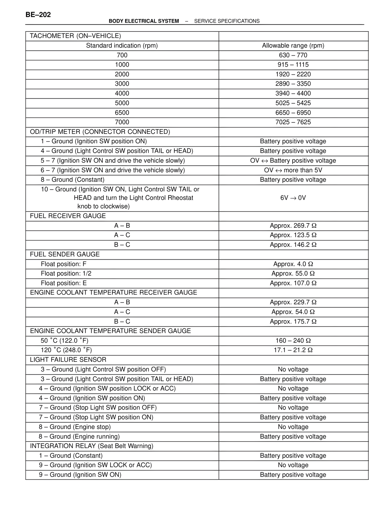 BODY ELECTRICAL SYSTEM – SERVICE SPECIFICATIONS