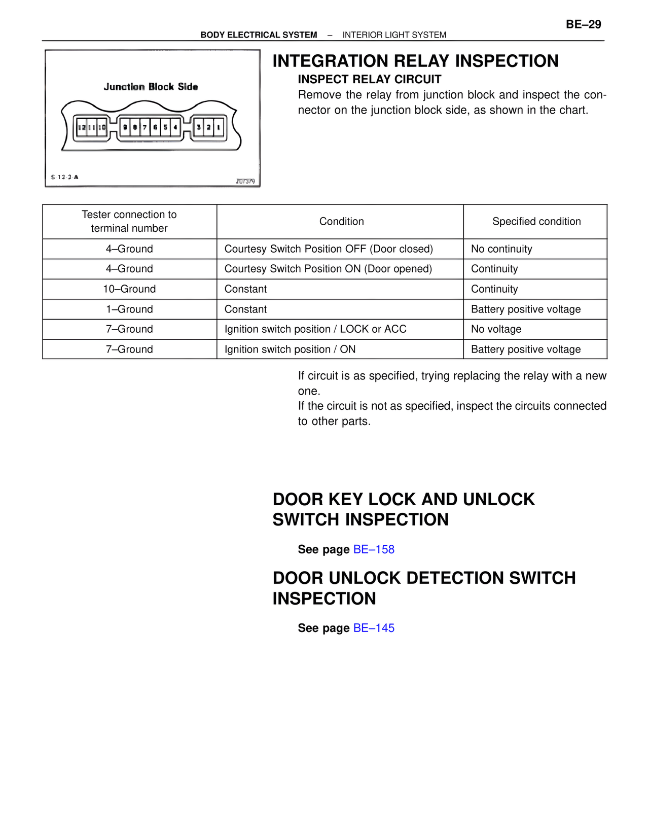Remove the relay from junction block and inspect the connector on the junction block side, as shown in the chart.