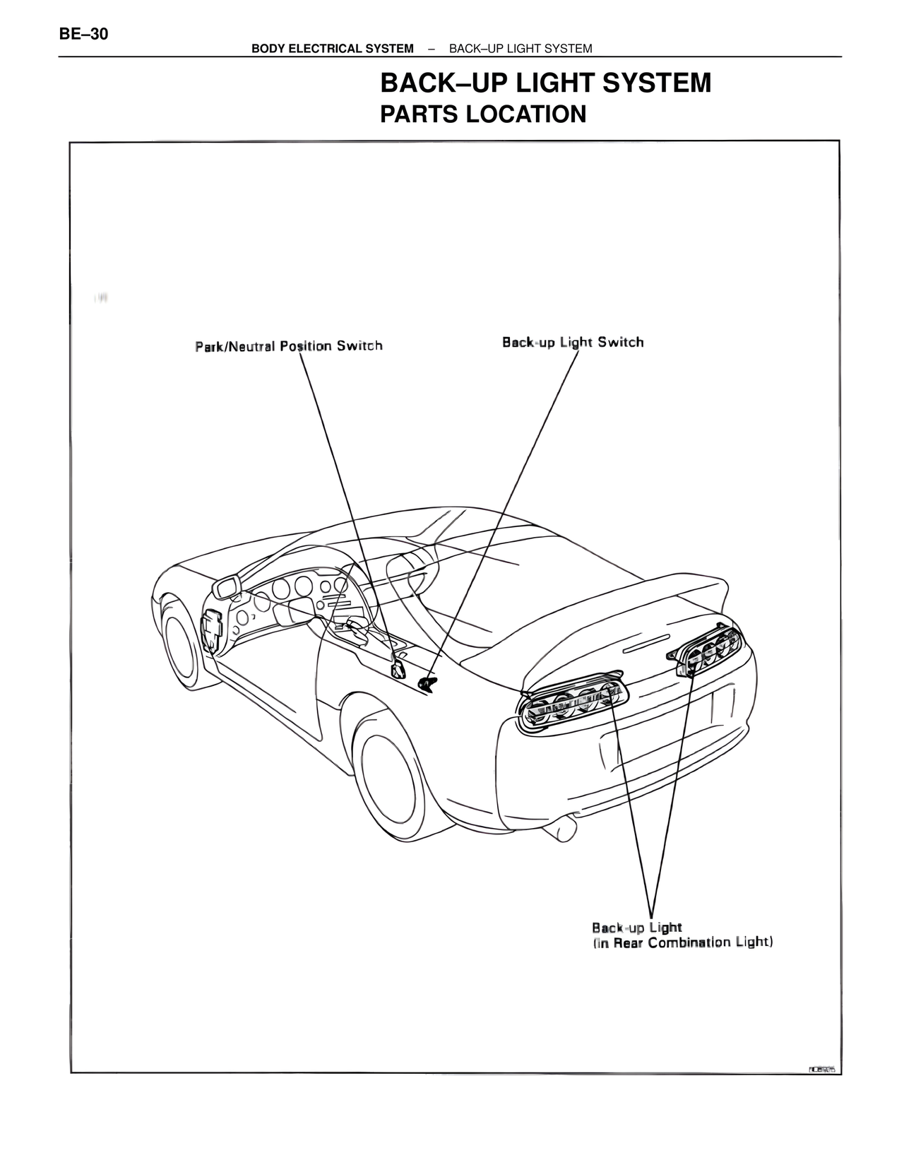 BE–30 BODY ELECTRICAL SYSTEM – BACK–UP LIGHT SYSTEM BACK–UP LIGHT SYSTEM PARTS LOCATION Park/Neutral Position Switch Back-up Light Switch Back-up Light (in Rear Combination Light) N08505