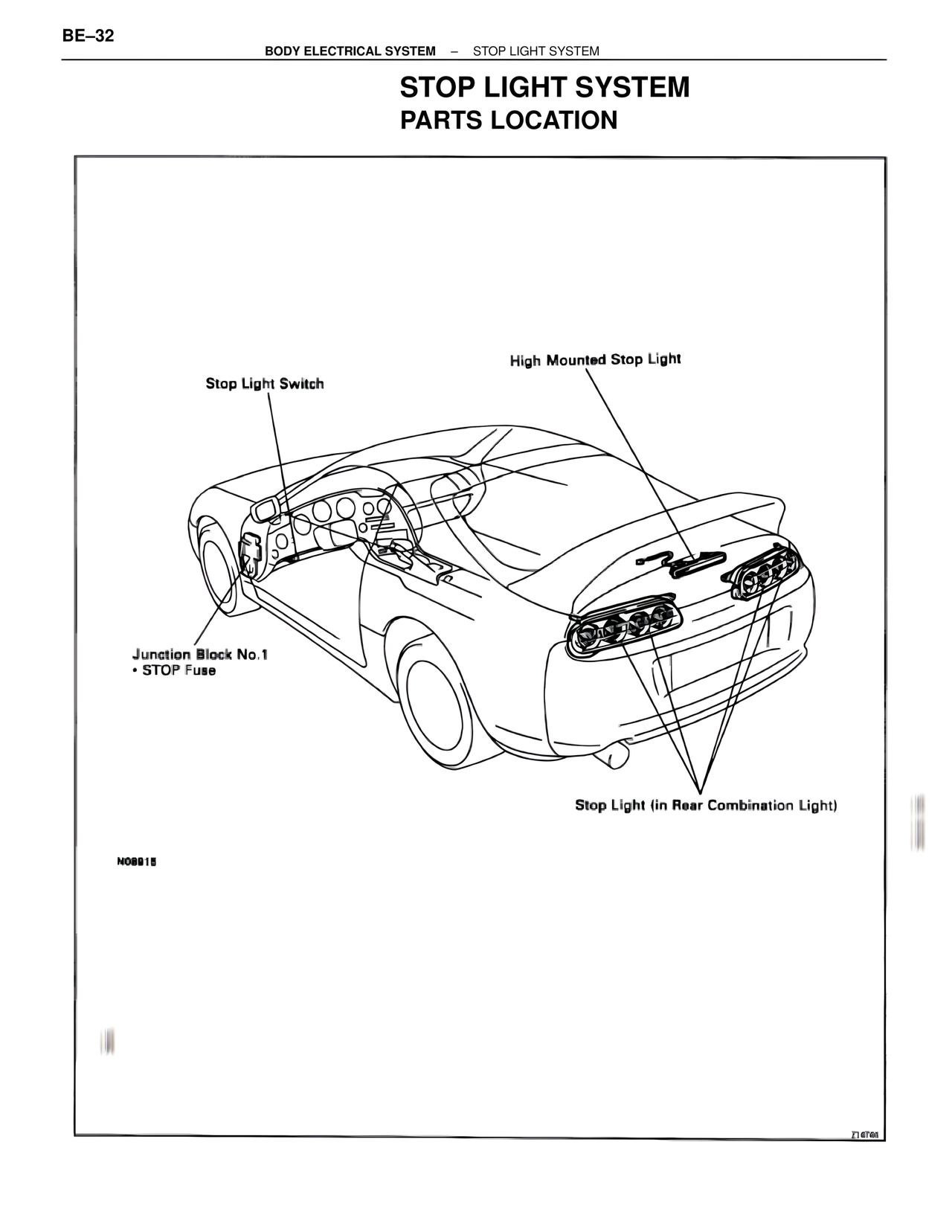BE–32 BODY ELECTRICAL SYSTEM – STOP LIGHT SYSTEM STOP LIGHT SYSTEM PARTS LOCATION High Mounted Stop Light Stop Light Switch Junction Block No.1 • STOP Fuse Stop Light (in Rear Combination Light) N08815 Z14796