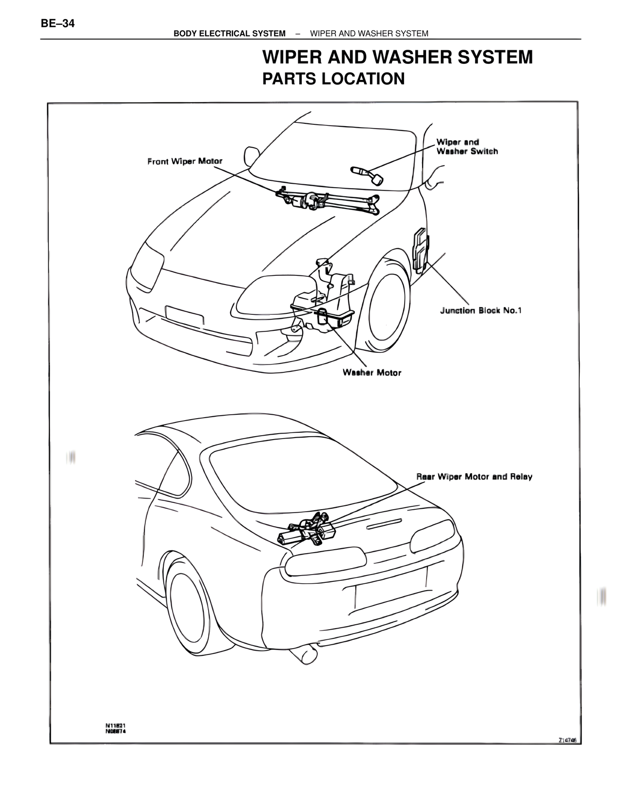 BE–34 BODY ELECTRICAL SYSTEM – WIPER AND WASHER SYSTEM WIPER AND WASHER SYSTEM PARTS LOCATION Front Wiper Motor Wiper and Washer Switch Junction Block No.1 Washer Motor Rear Wiper Motor and Relay N11621 N08874 214746