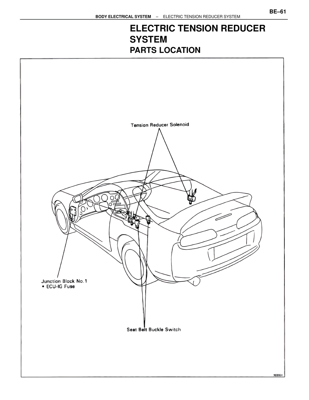 BODY ELECTRICAL SYSTEM – ELECTRIC TENSION REDUCER SYSTEM BE–61 ELECTRIC TENSION REDUCER SYSTEM PARTS LOCATION Tension Reducer Solenoid Junction Block No.1 • ECU-IG Fuse Seat Belt Buckle Switch ND89994
