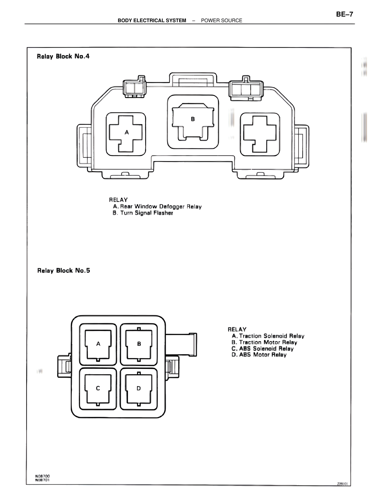 Relay Block No.4 A B RELAY A. Rear Window Defogger Relay B. Turn Signal Flasher Relay Block No.5 A B C D RELAY A. Traction Solenoid Relay B. Traction Motor Relay C. ABS Solenoid Relay D. ABS Motor Relay N08700 N08701