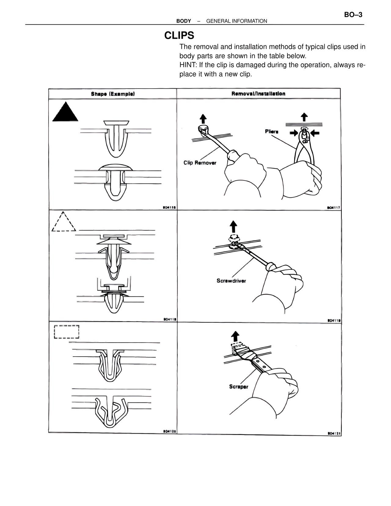 The removal and installation methods of typical clips used in body parts are shown in the table below.