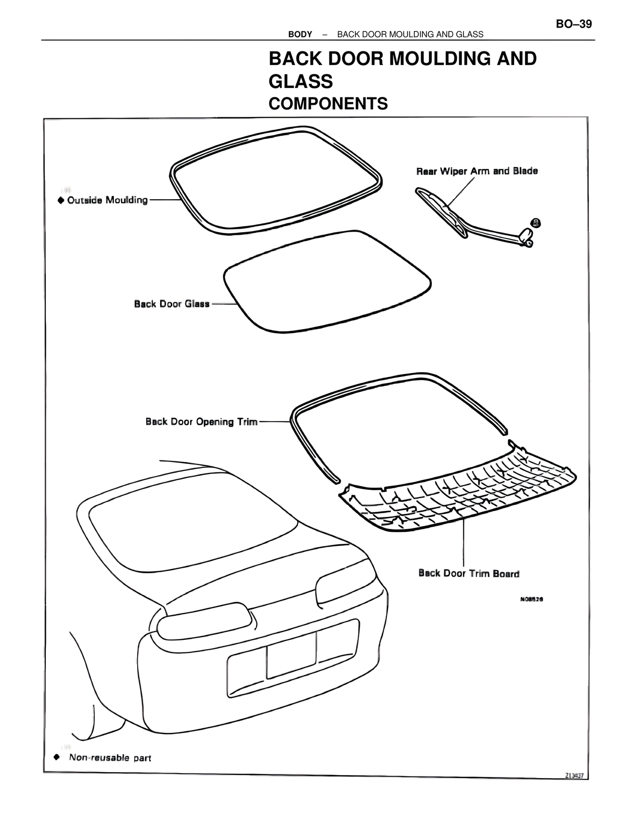 BO-39 BODY – BACK DOOR MOULDING AND GLASS BACK DOOR MOULDING AND GLASS COMPONENTS ♦ Outside Moulding Rear Wiper Arm and Blade Back Door Glass Back Door Opening Trim Back Door Trim Board N08526 ♦ Non-reusable part 213437