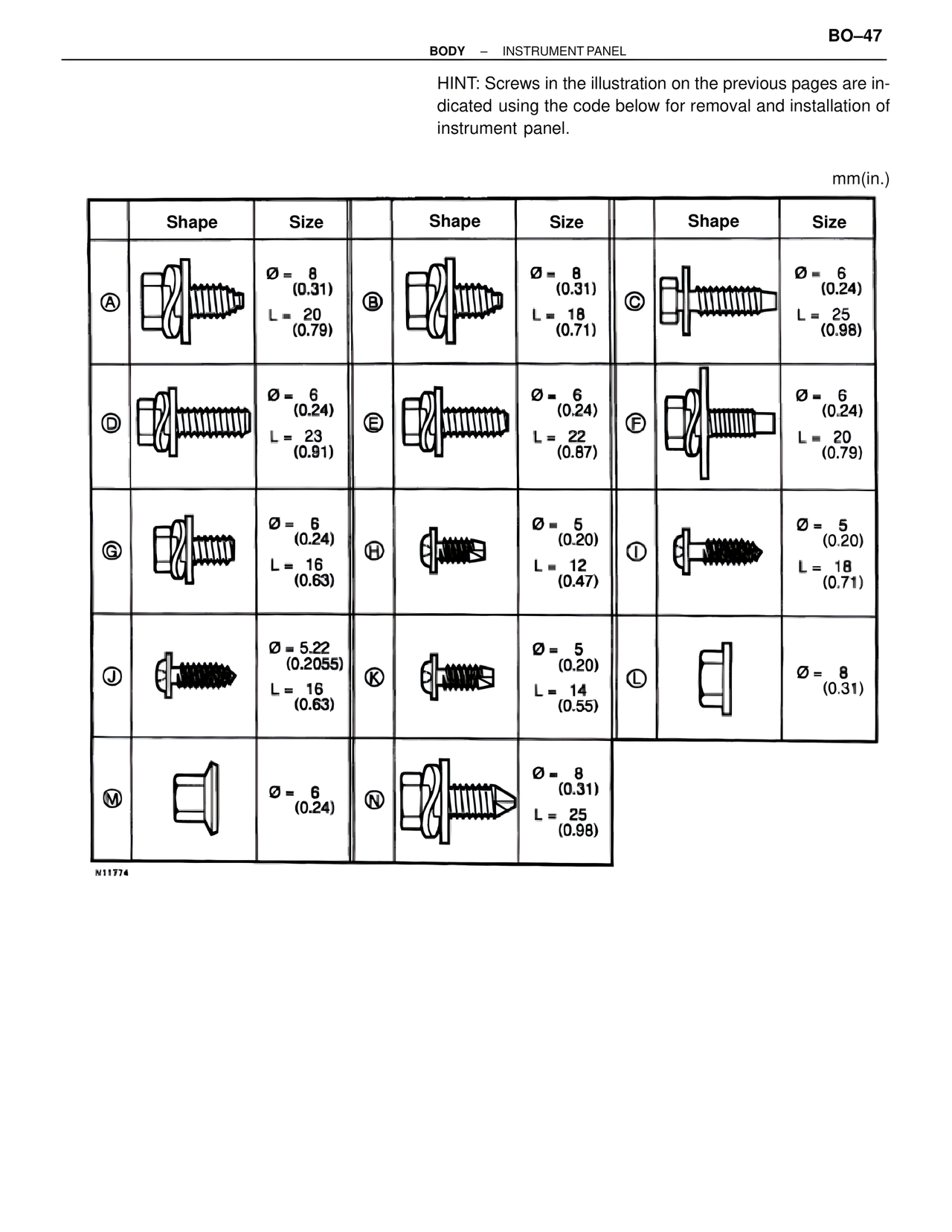 HINT: Screws in the illustration on the previous pages are indicated using the code below for removal and installation of instrument panel.
