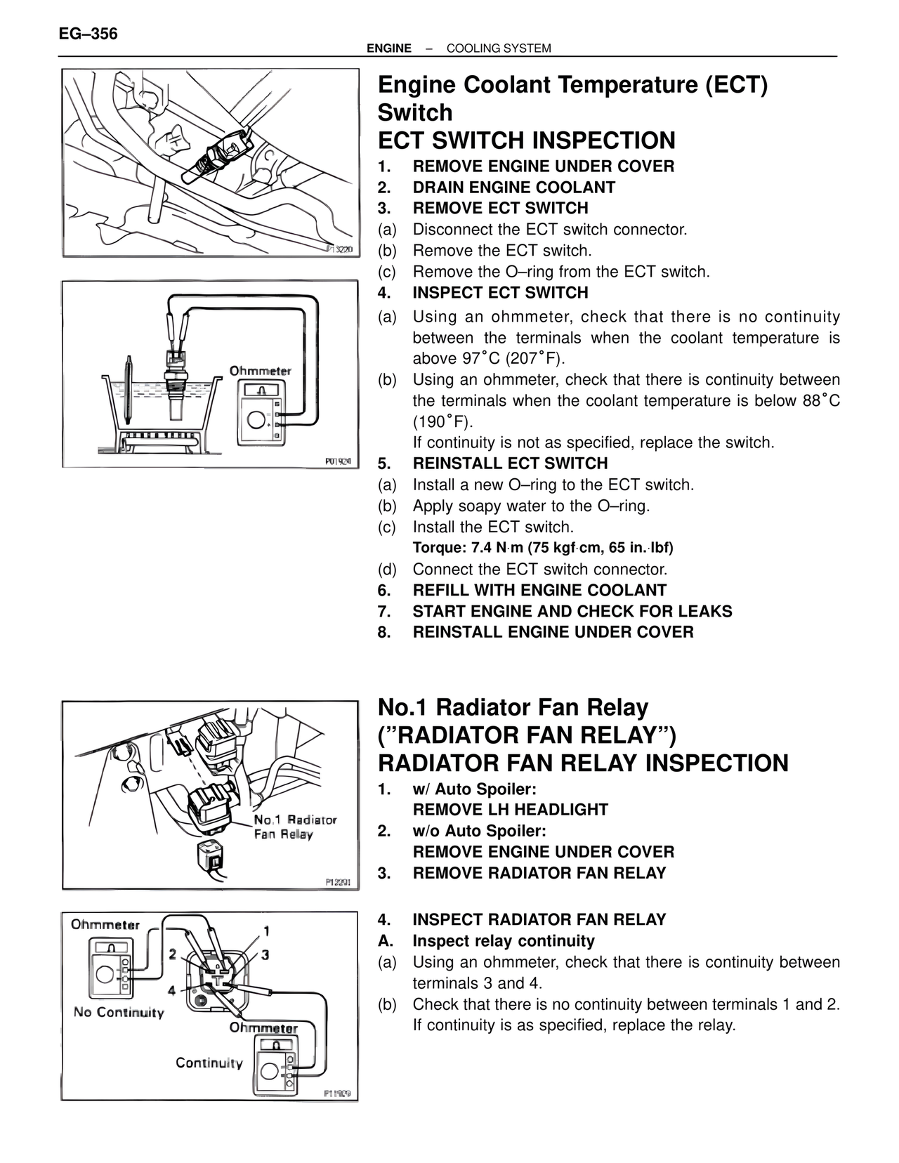 (b) Using an ohmmeter, check that there is continuity between the terminals when the coolant temperature is below 88°C (190°F).