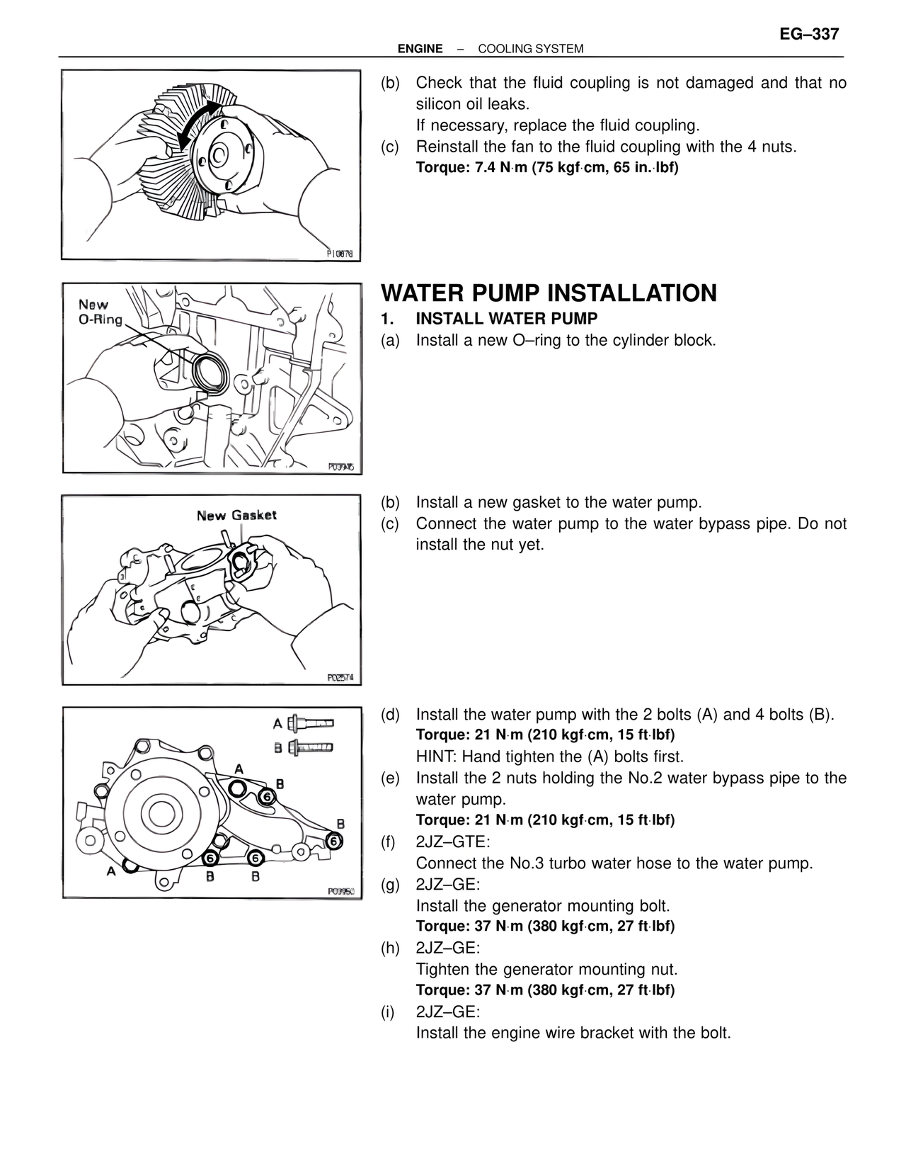 (d) Install the water pump with the 2 bolts (A) and 4 bolts (B).