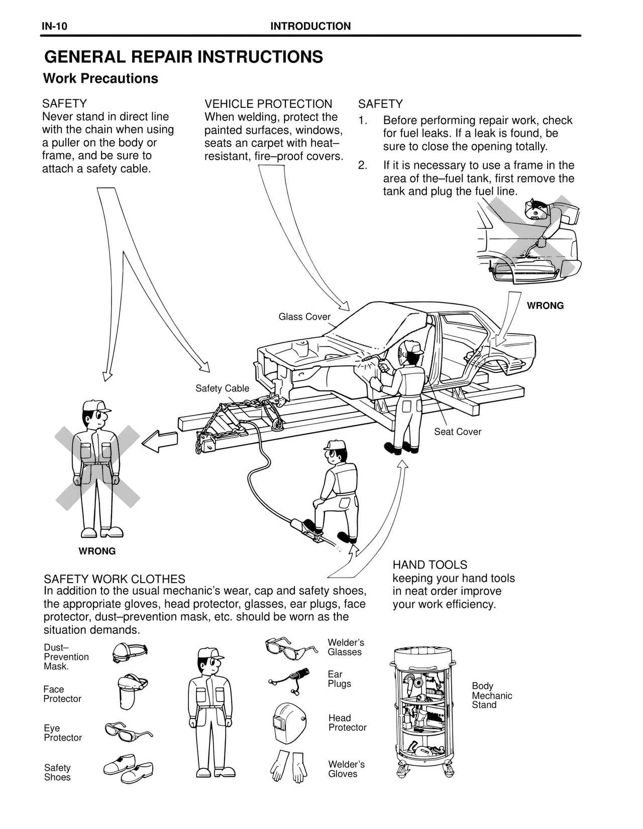 In addition to the usual mechanic's wear, cap and safety shoes, the appropriate gloves, head protector, glasses, ear plugs, face protector, dust–prevention mask, etc. should be worn as the situation demands.