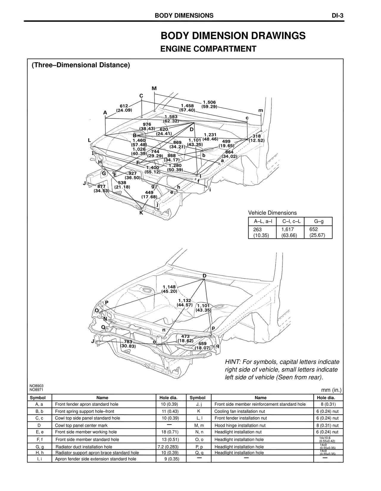 F, f Front side member standard hole 13 (0.51) O, o Headlight installation hole 14x10.6