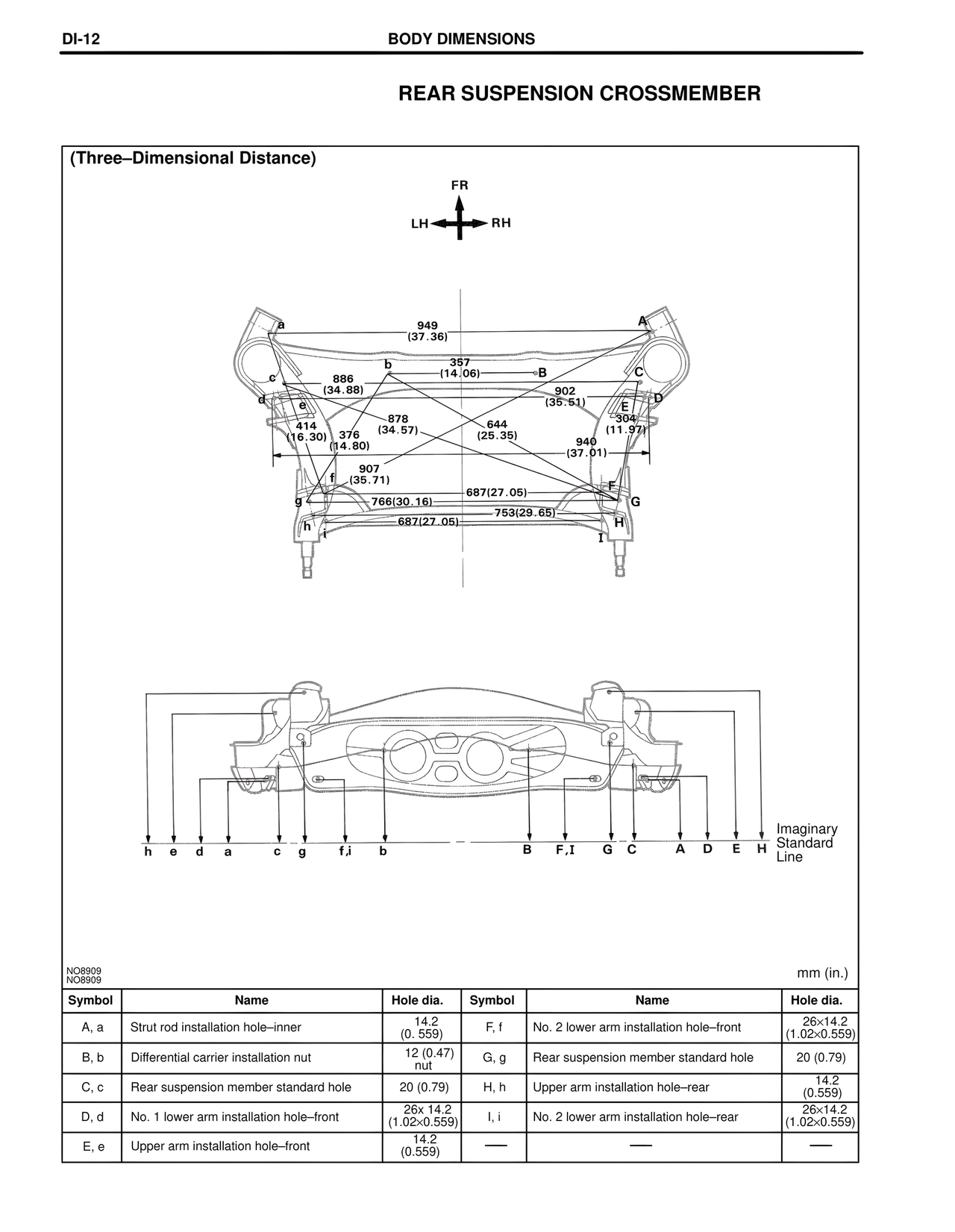 C, c Rear suspension member standard hole 20 (0.79) H, h Upper arm installation hole–rear 14.2