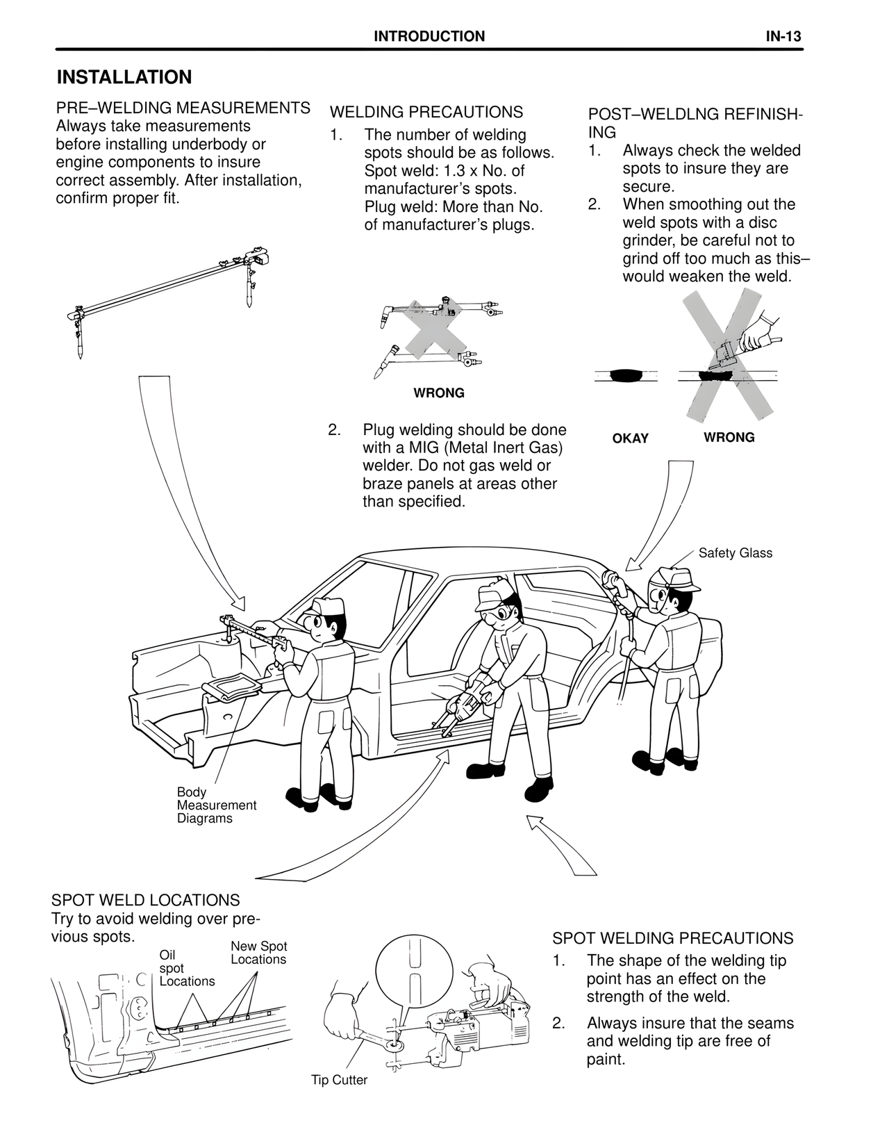 2. Plug welding should be done with a MIG (Metal Inert Gas) welder. Do not gas weld or braze panels at areas other than specified.