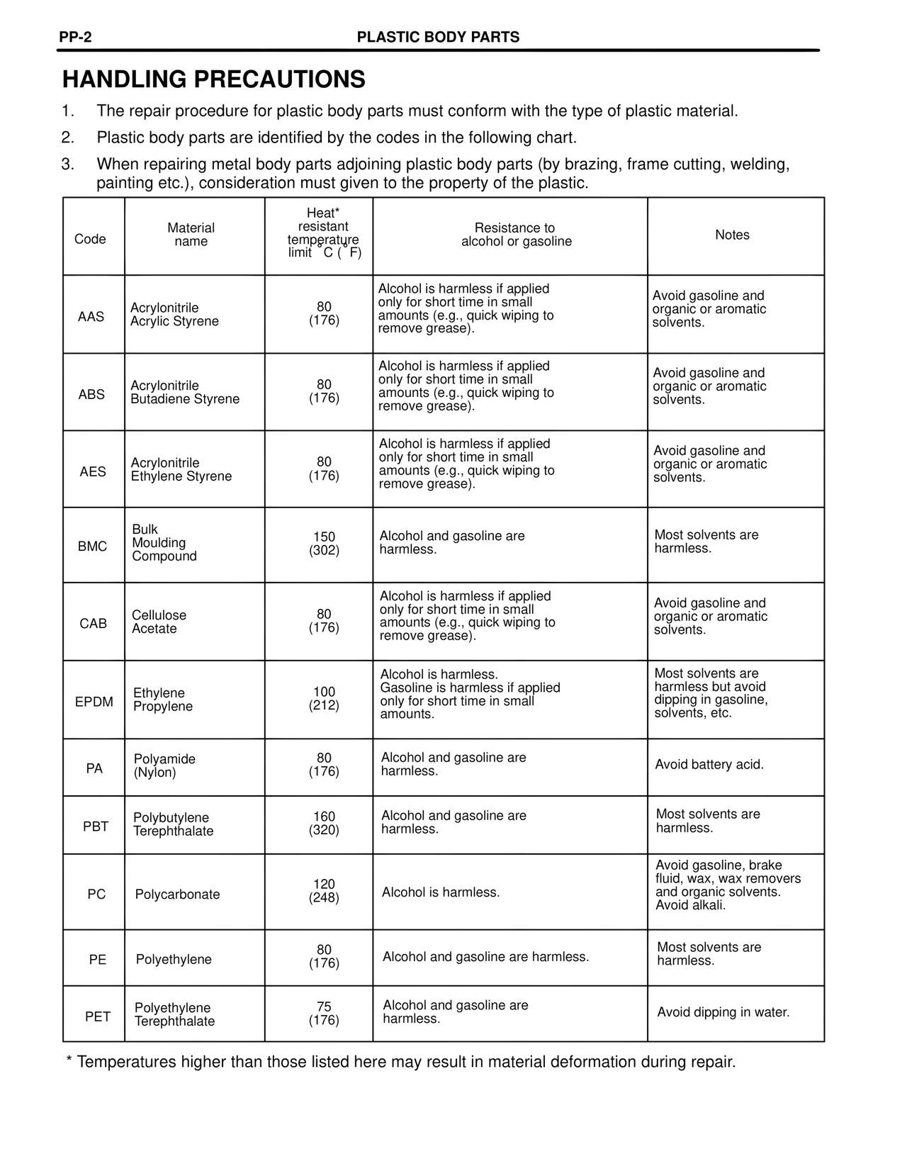 * Temperatures higher than those listed here may result in material deformation during repair.