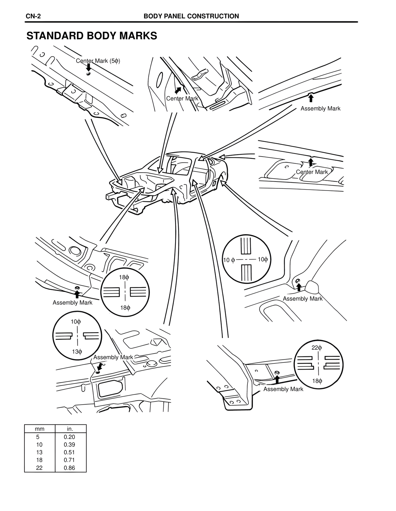CN-2 BODY PANEL CONSTRUCTION STANDARD BODY MARKS Center Mark (5φ) Center Mark Assembly Mark Center Mark 18φ Assembly Mark 18φ 10φ —— 10φ Assembly Mark 10φ 13φ Assembly Mark 22φ 18φ Assembly Mark mm in. 5 0.20 10 0.39 13 0.51 18 0.71 22 0.86