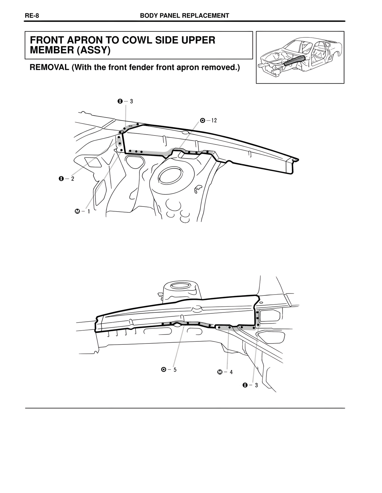 RE-8 BODY PANEL REPLACEMENT FRONT APRON TO COWL SIDE UPPER MEMBER (ASSY) REMOVAL (With the front fender front apron removed.) ❶ - 3 ⊙ - 12 ❶ - 2 Ⓜ - 1 ⊙ - 5 Ⓜ - 4 ❶ - 3