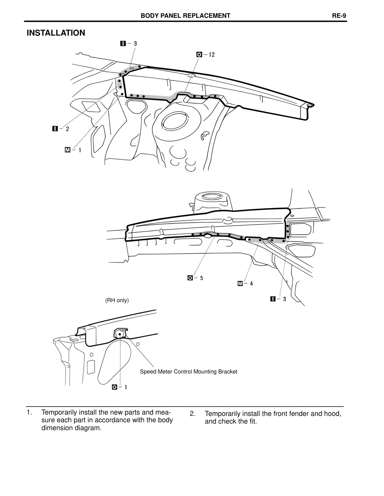 1. Temporarily install the new parts and measure each part in accordance with the body dimension diagram.