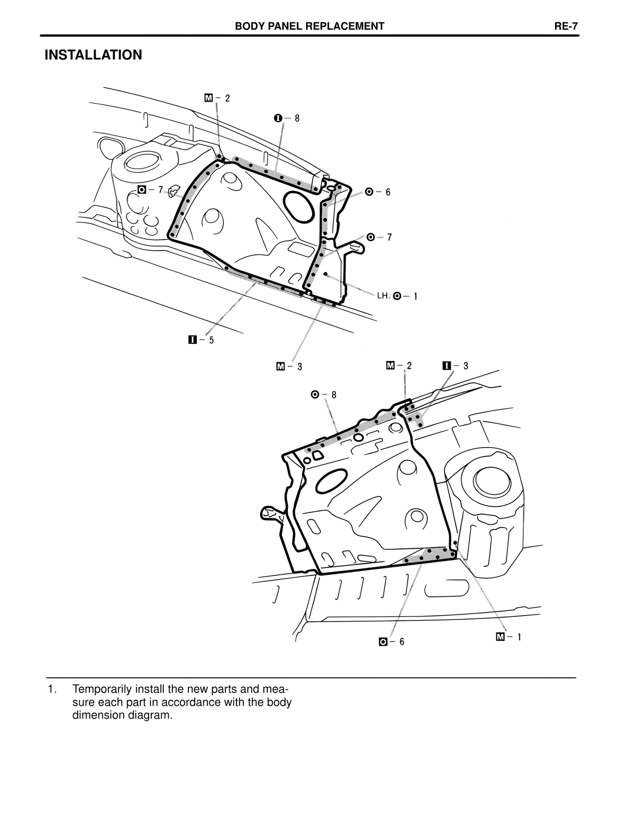 BODY PANEL REPLACEMENT INSTALLATION M - 2 0 - 8 0 - 7 0 - 6 0 - 7 LH: 0 - 1 0 - 5 M - 3 M - 2 0 - 3 0 - 8 0 - 6 M - 1 1. Temporarily install the new parts and measure each part in accordance with the body dimension diagram.