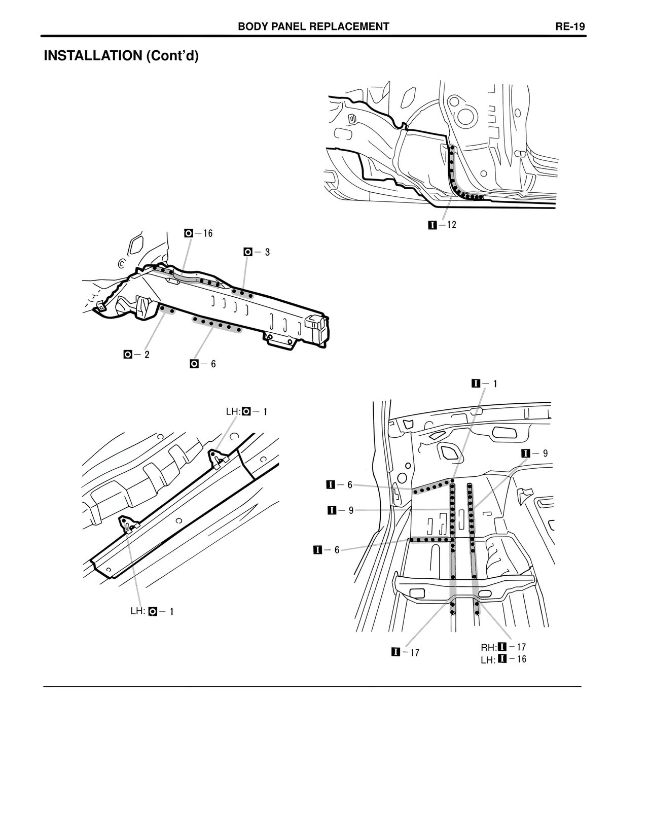BODY PANEL REPLACEMENT RE-19 INSTALLATION (Cont'd) ■ - 12 ○ - 16 ○ - 3 ○ - 2 ○ - 6 ■ - 1 LH:○ - 1 ■ - 9 ■ - 6 ■ - 9 ■ - 6 LH:○ - 1 ■ - 17 RH:■ - 17 LH:■ - 16