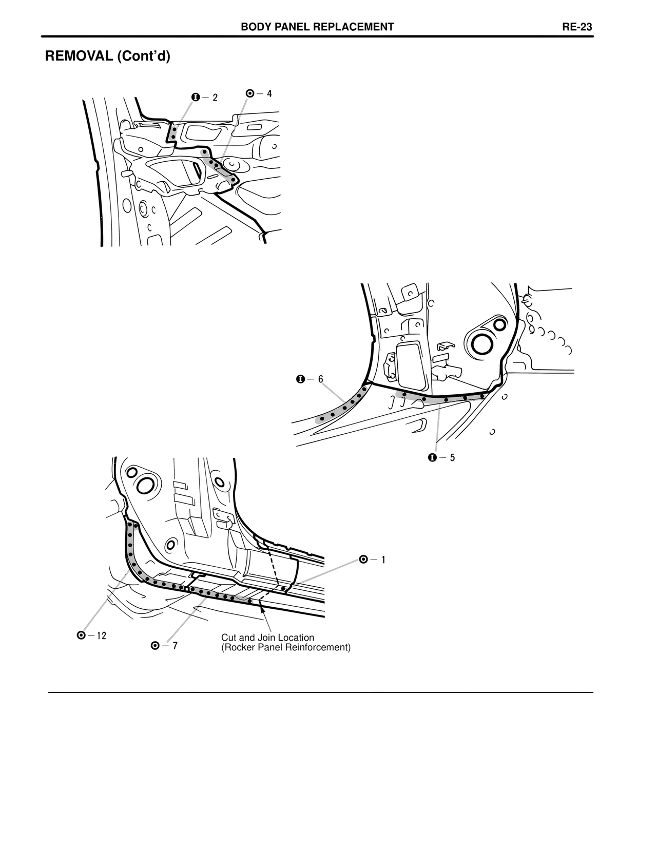 BODY PANEL REPLACEMENT RE-23 REMOVAL (Cont'd) ❶ - 2 ⊙ - 4 ❶ - 6 ❶ - 5 ⊙ - 1 ⊙ - 12 ⊙ - 7 Cut and Join Location (Rocker Panel Reinforcement)