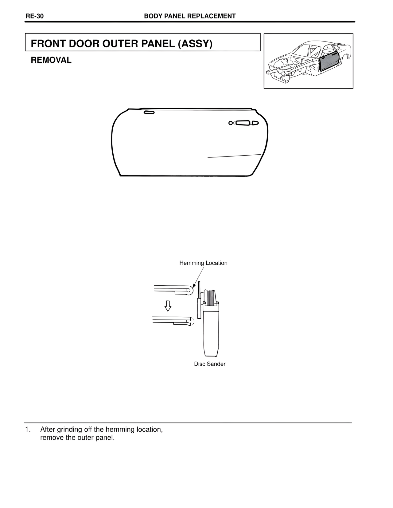 RE-30 BODY PANEL REPLACEMENT FRONT DOOR OUTER PANEL (ASSY) REMOVAL Hemming Location Disc Sander 1. After grinding off the hemming location, remove the outer panel.