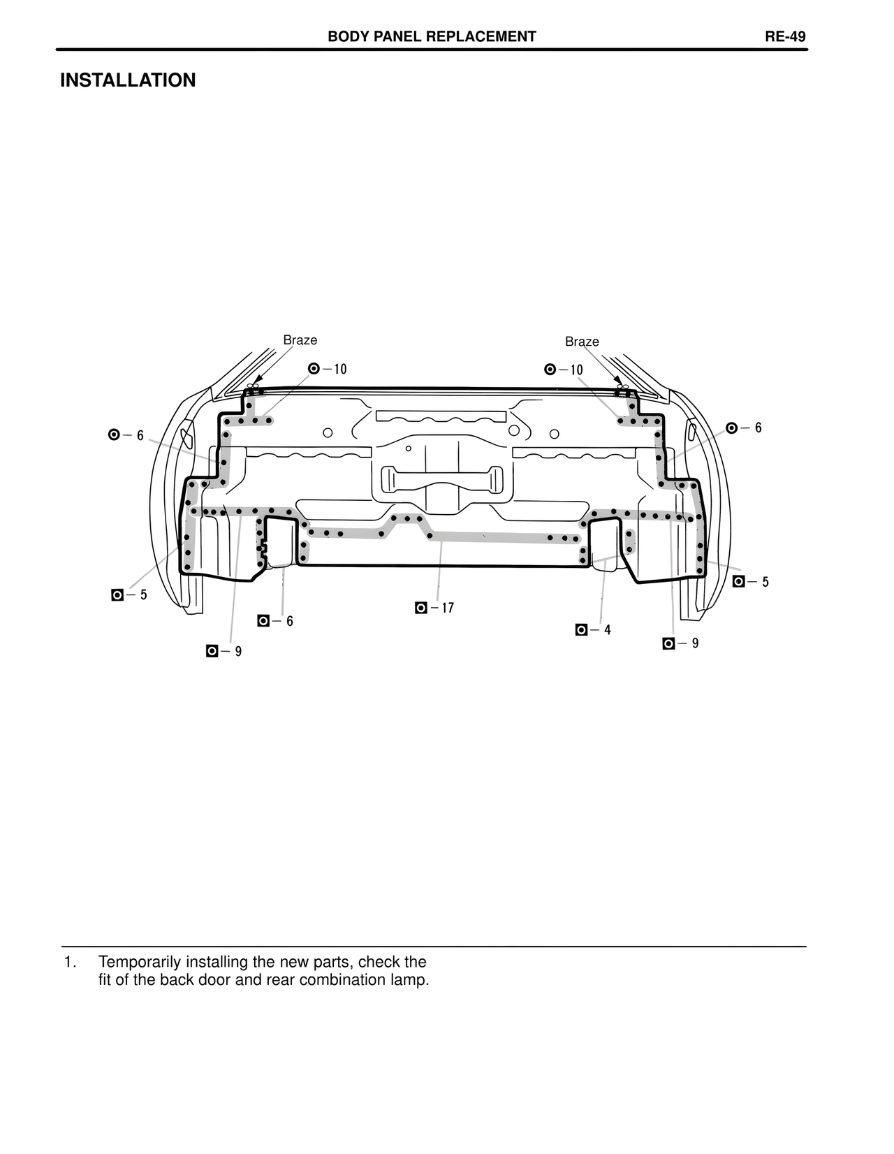 BODY PANEL REPLACEMENT RE-49 INSTALLATION Braze Braze ⊙-10 ⊙-10 ⊙-6 ⊙-6 ⊙-5 ⊙-5 ⊙-9 ⊙-6 ⊙-17 ⊙-4 ⊙-9 1. Temporarily installing the new parts, check the fit of the back door and rear combination lamp.