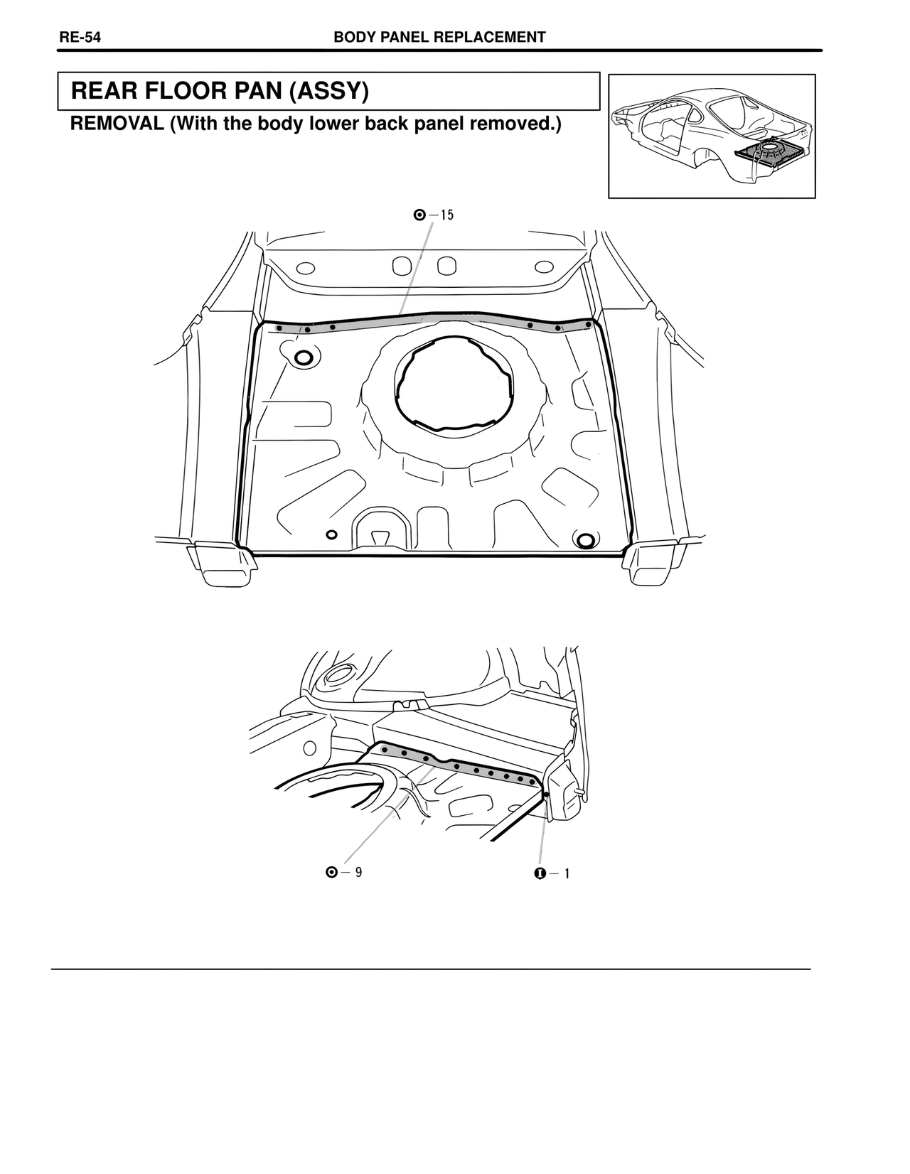 RE-54 BODY PANEL REPLACEMENT REAR FLOOR PAN (ASSY) REMOVAL (With the body lower back panel removed.) ⊙ - 15 ⊙ - 9 ● - 1